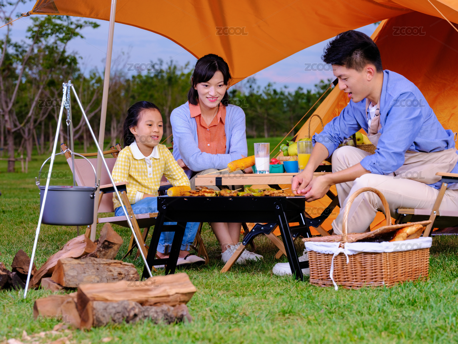 快樂的三口之家在公園燒烤
