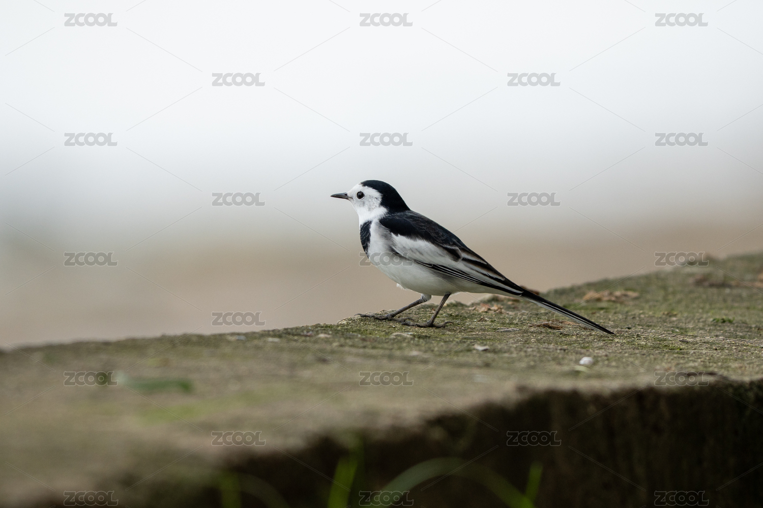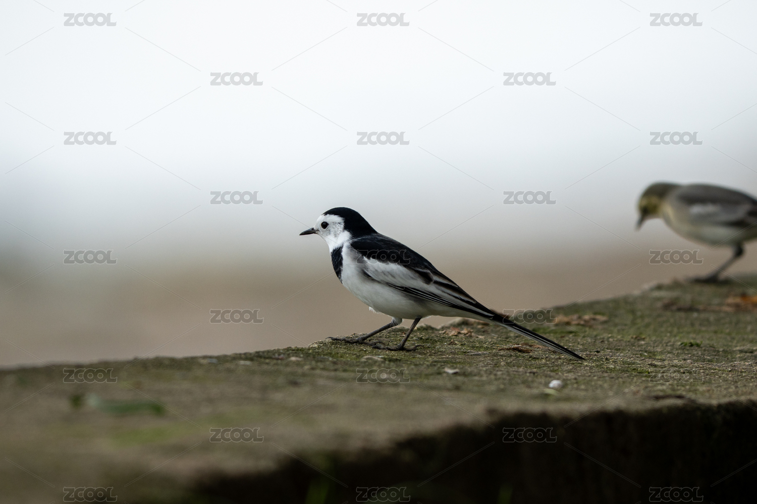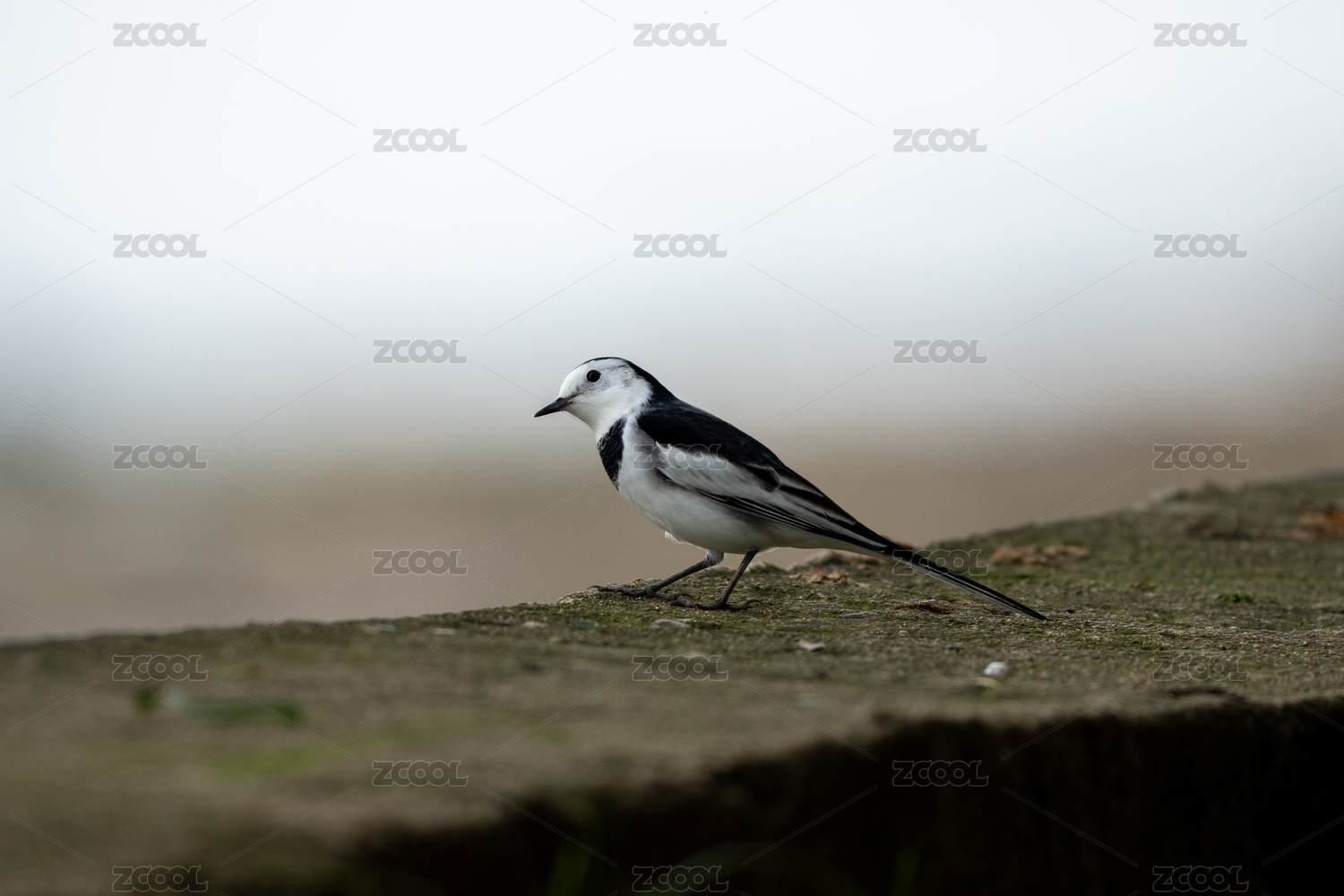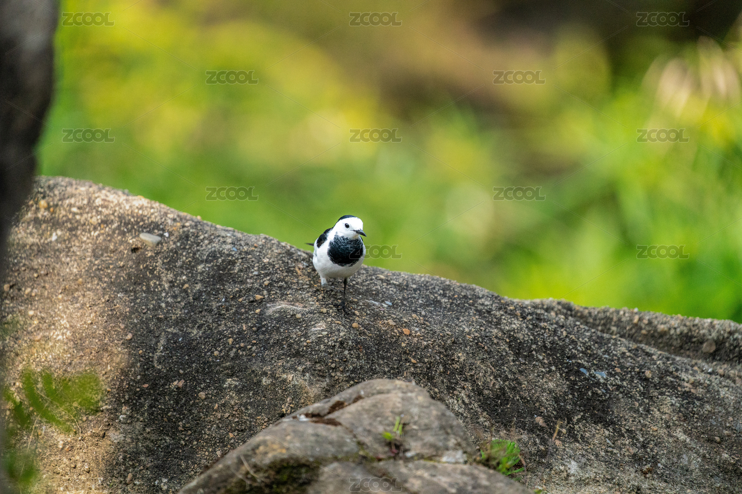 一只白鹡鸰鳥駐守在池塘邊覓食的正面圖片