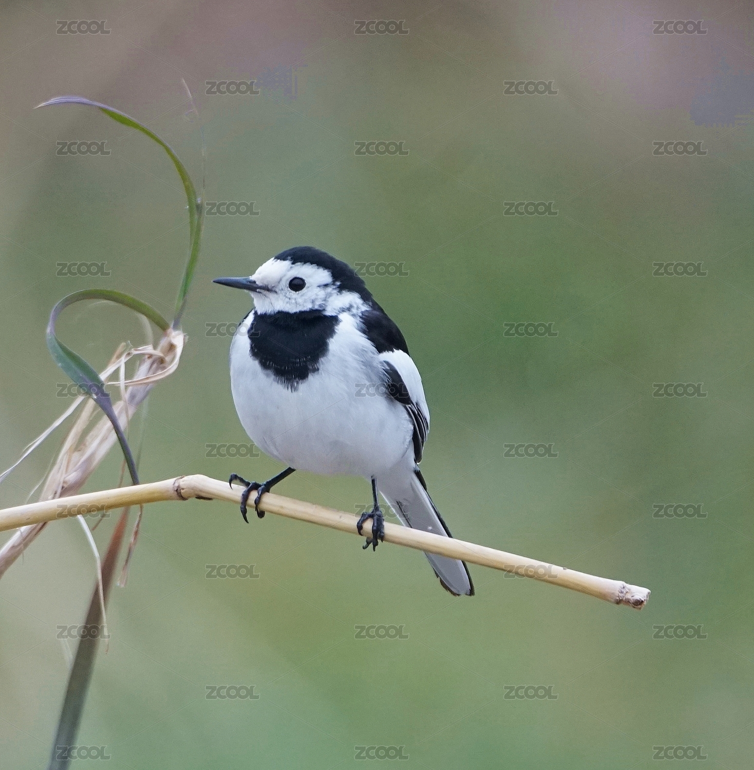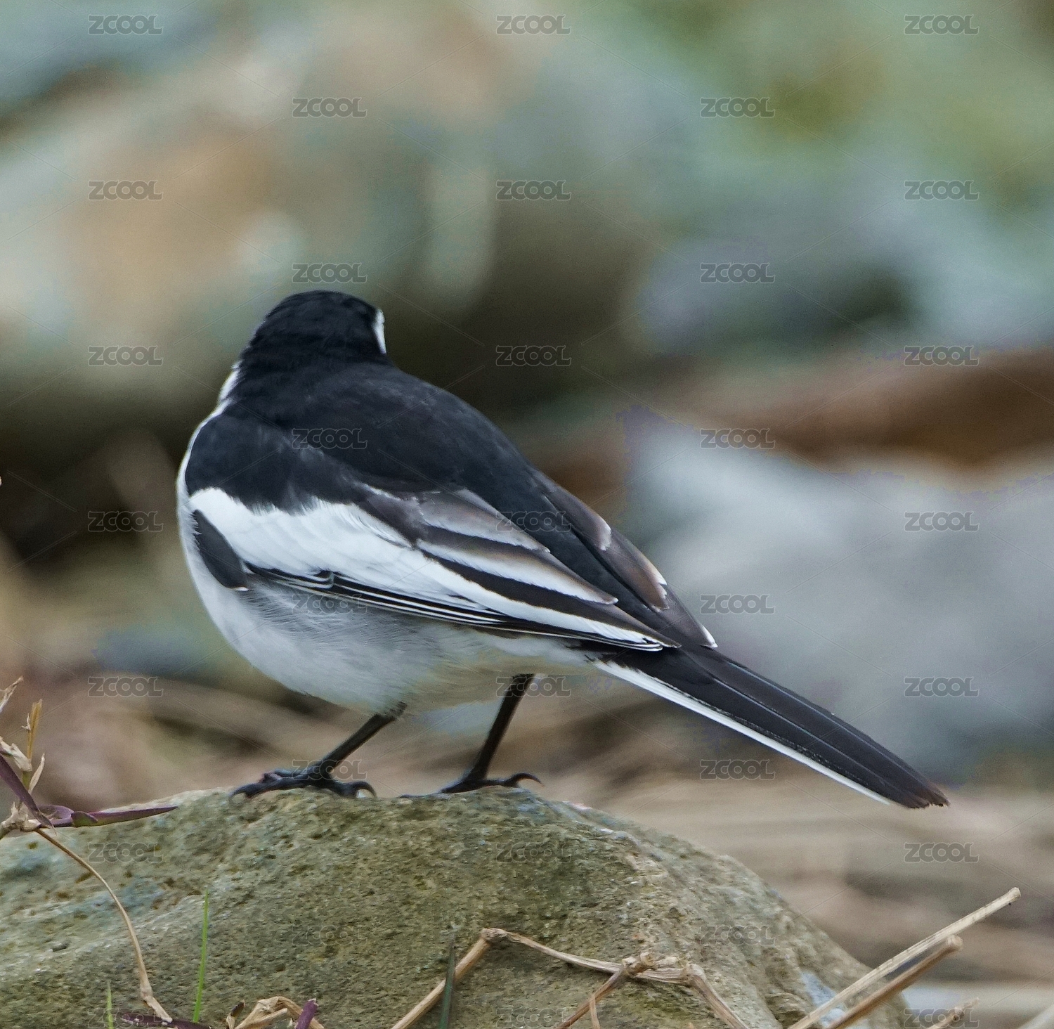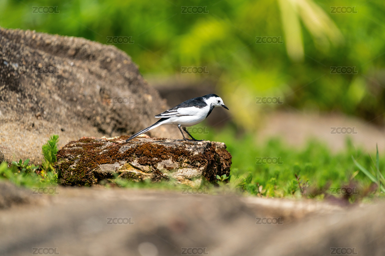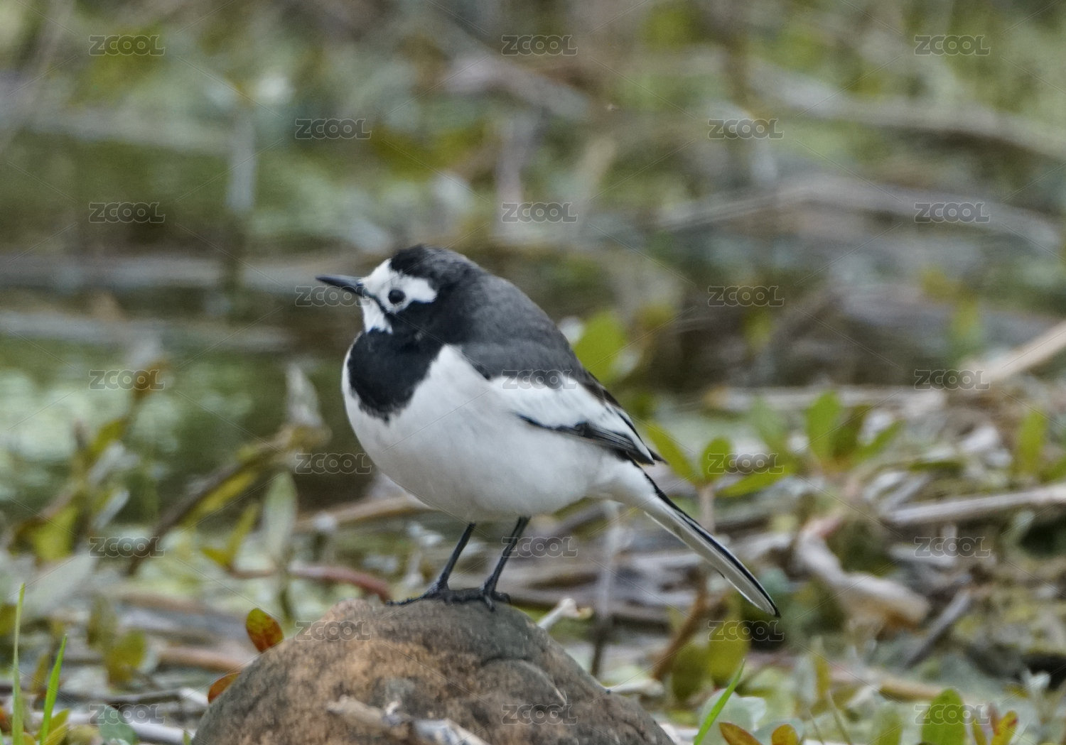 一只白鹡鸰鳥駐守在池塘邊覓食的正面圖片