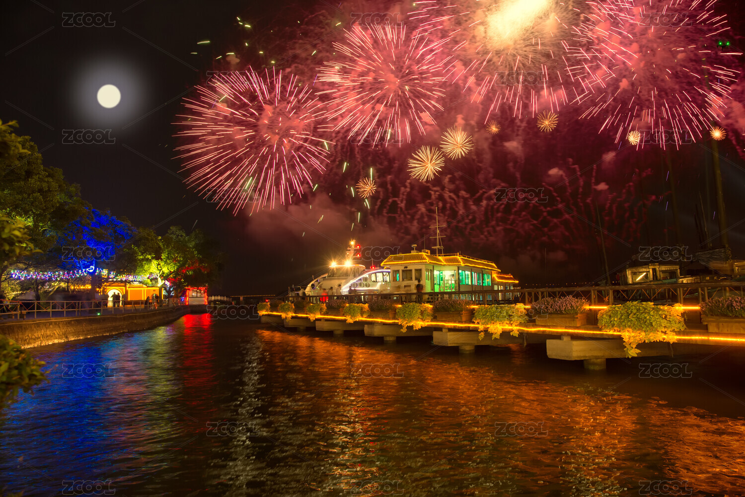 云南省西雙版納景洪市瀾滄江音樂噴泉煙花秀