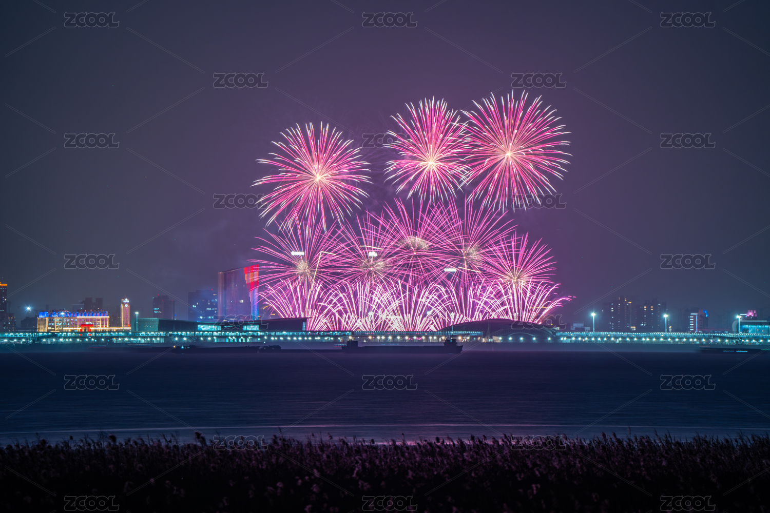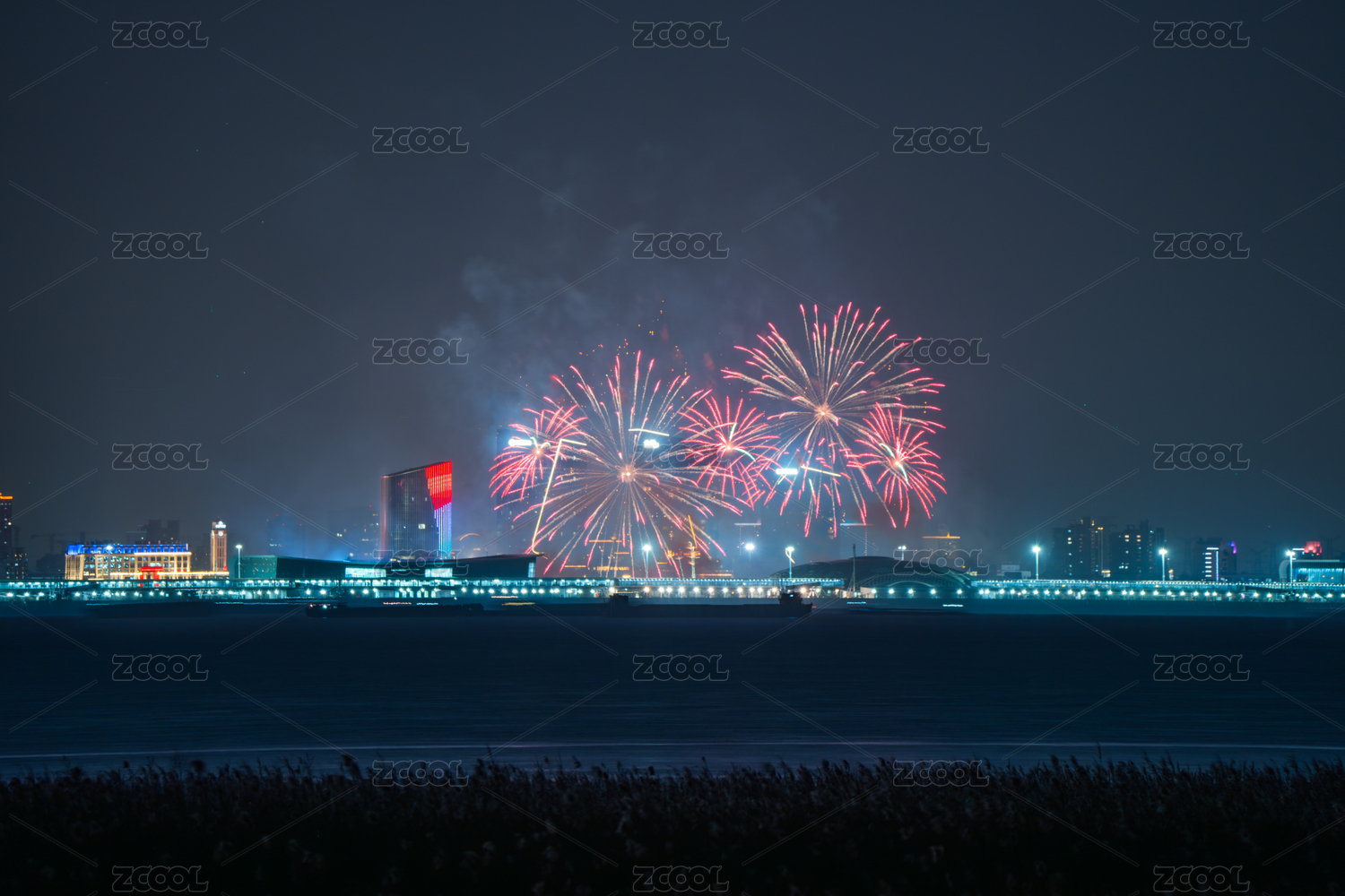 夜晚臨水城市燃放焰火燈火輝煌煙花秀