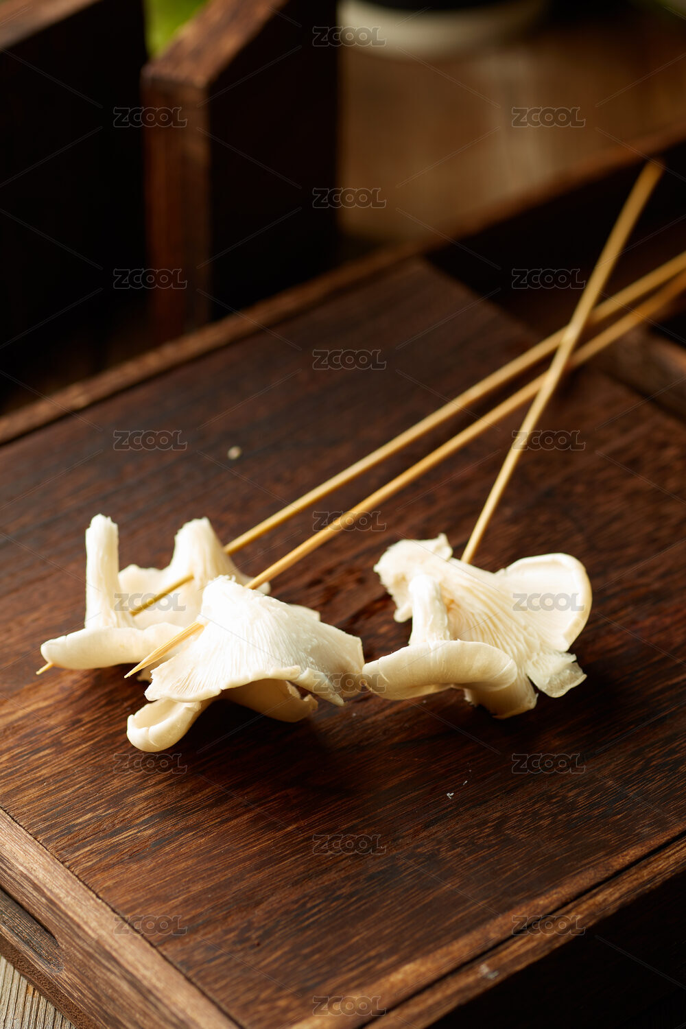 暗色調(diào)背景木盤上蘑菇肉絲