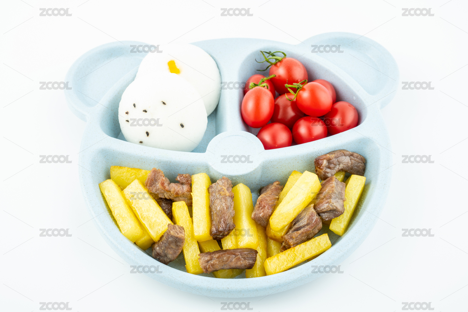 白背景上一盤兒童營養(yǎng)餐,牛肉燒土豆配米糕