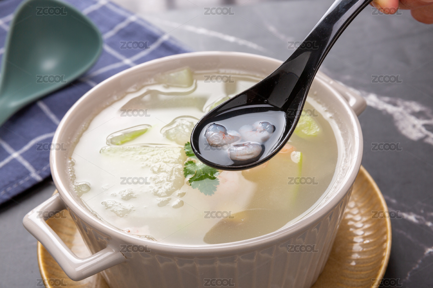 用勺子展示冬瓜湯里的蝦仁