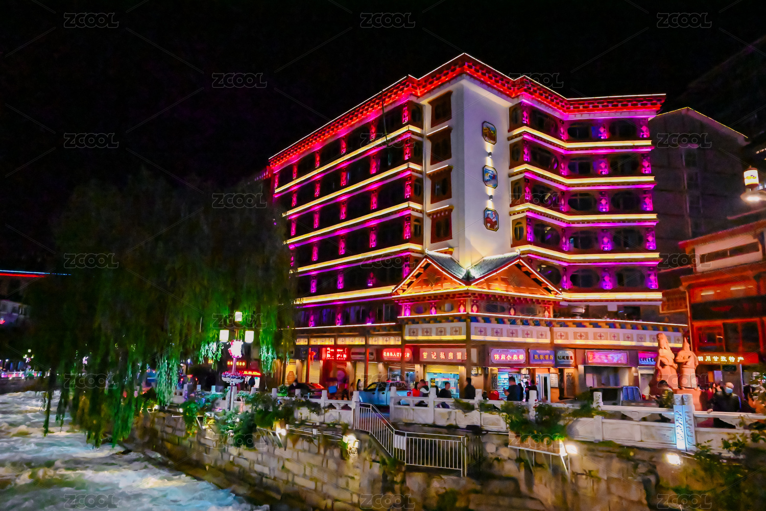 四川省康定市城市夜景河流燈光