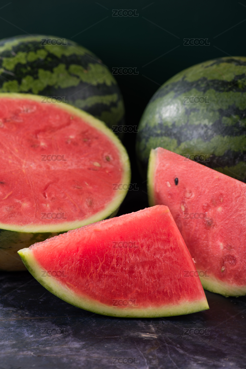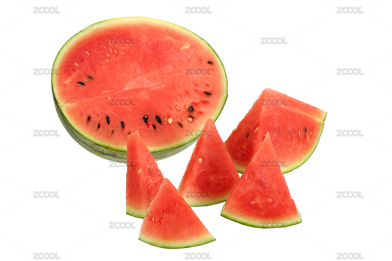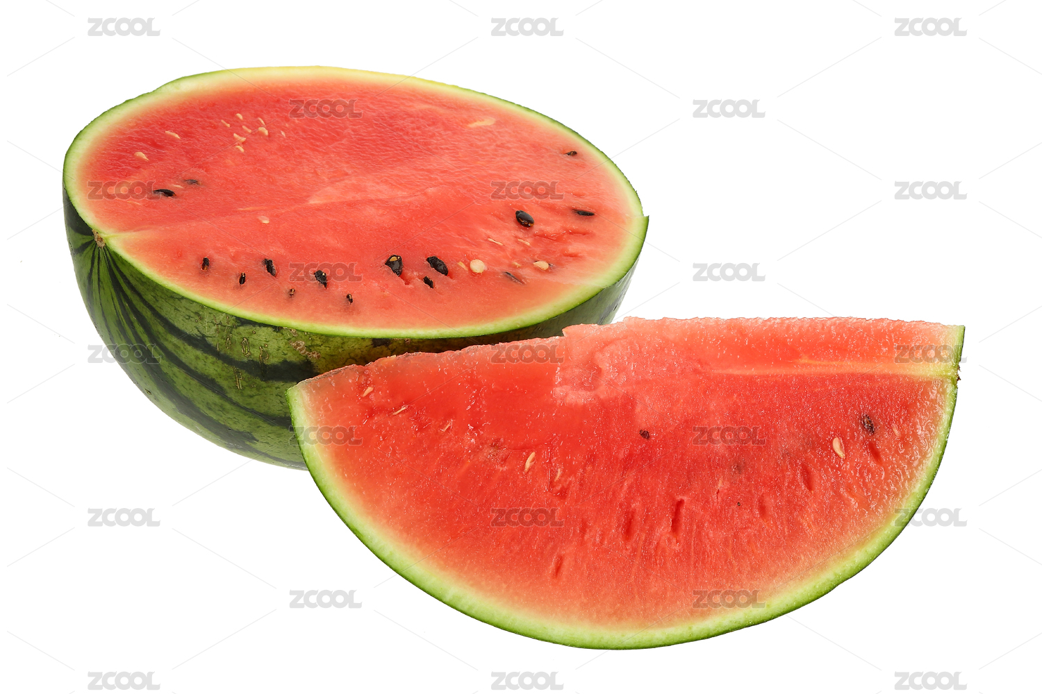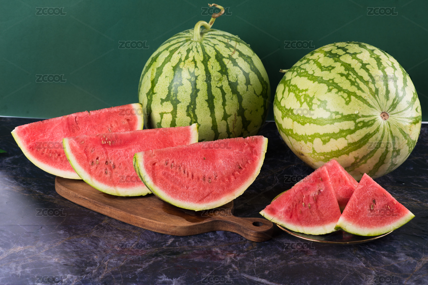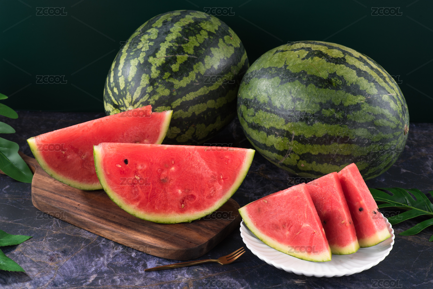 白底上放著一個(gè)麒麟瓜和半邊西瓜