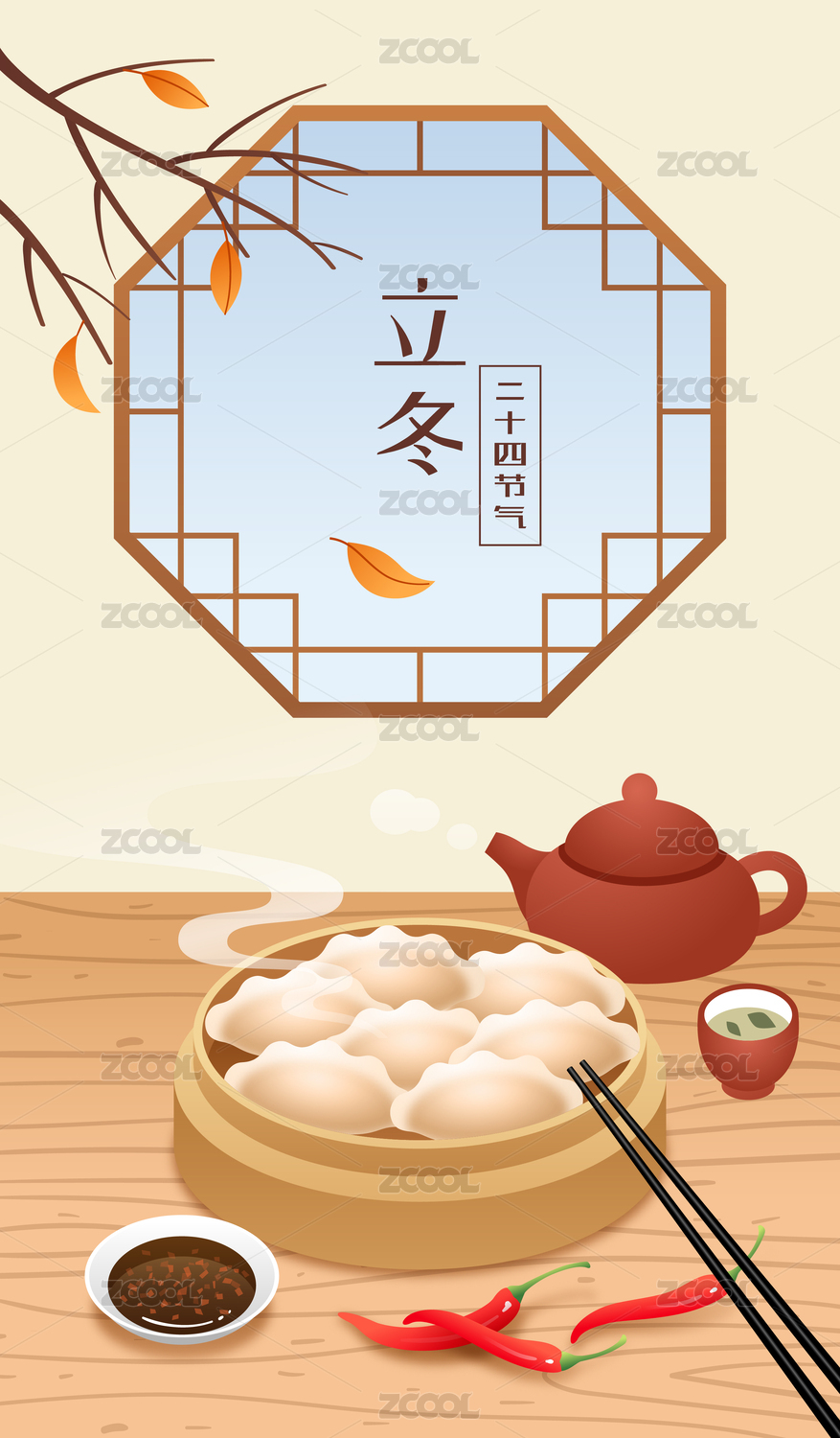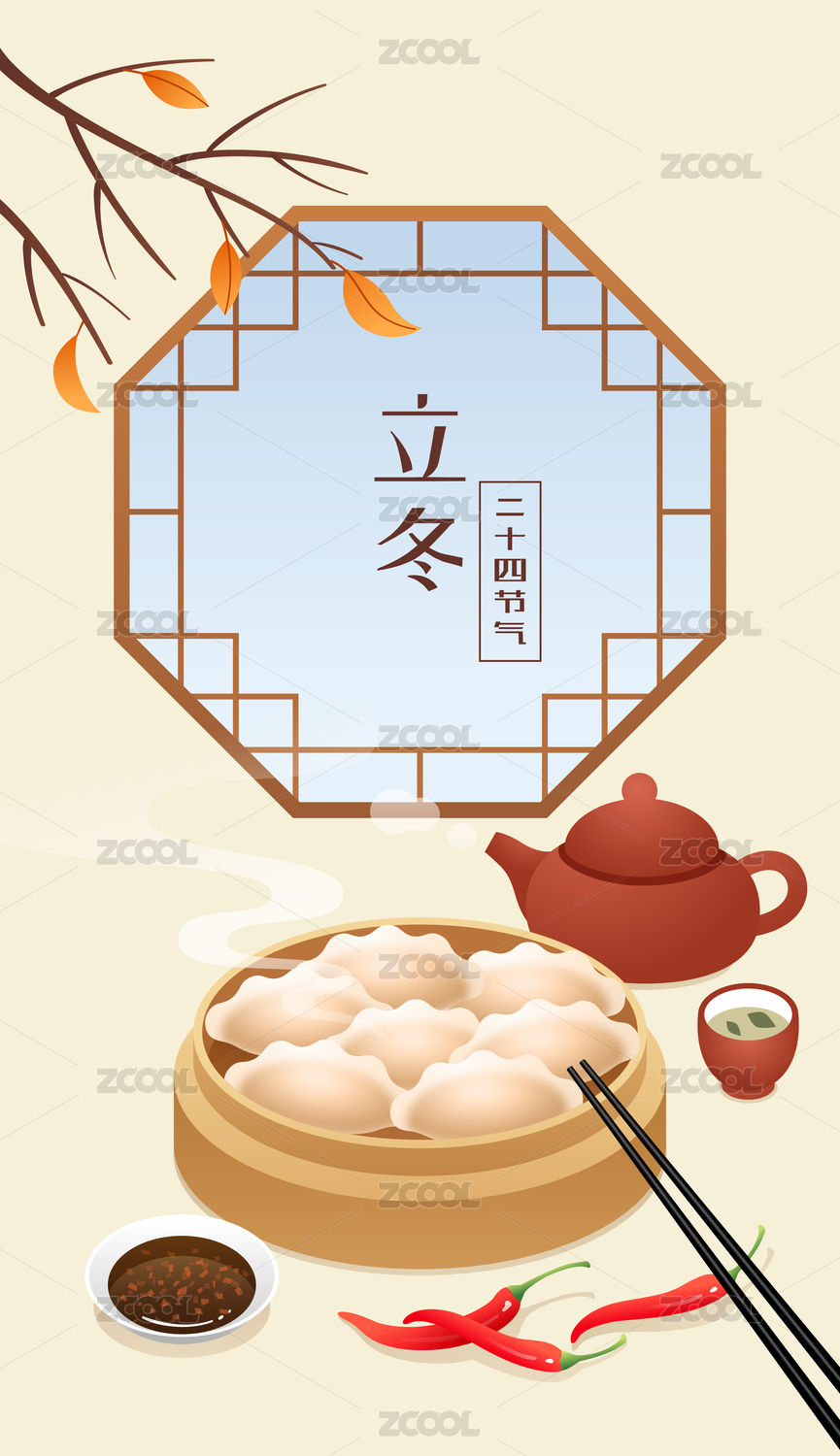 立冬時(shí)節(jié)花窗樹枝下的餃子茶壺等