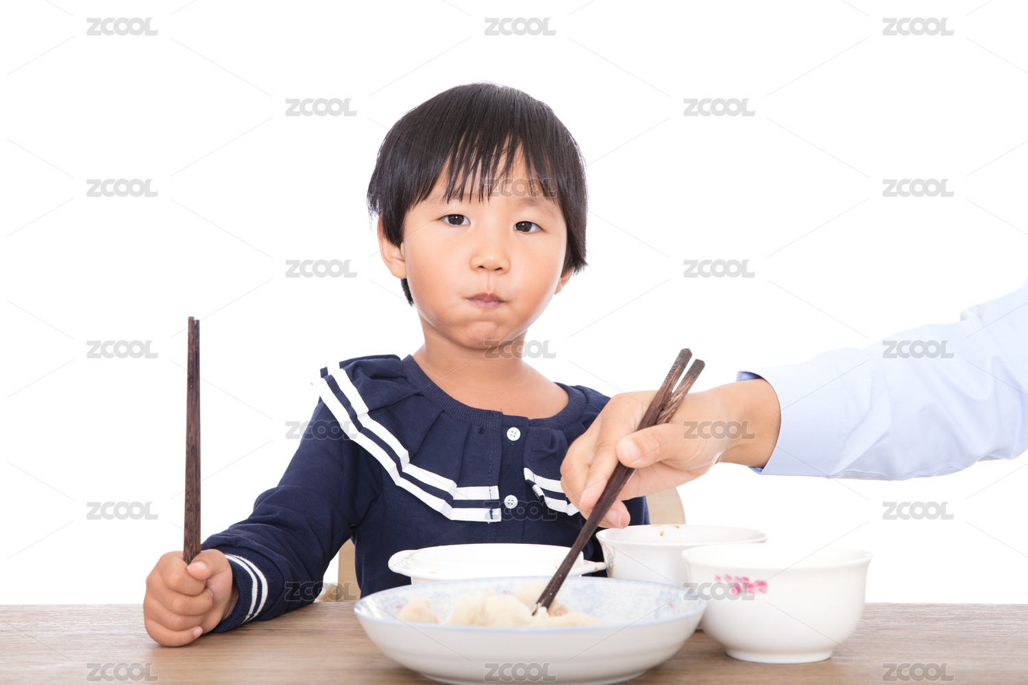 中國(guó)小姑娘在媽媽的監(jiān)督下吃餃子