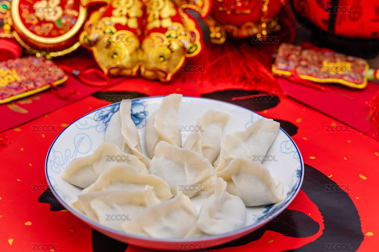 室內(nèi)棚拍福字福袋中國(guó)風(fēng)背景下的餃子