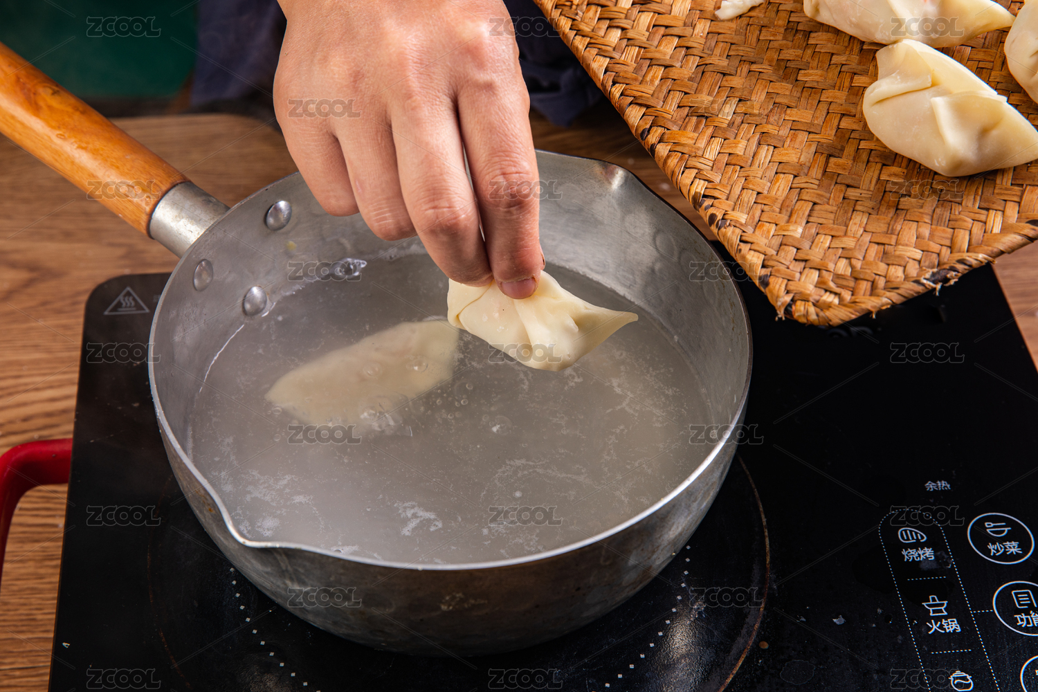 手拿餃子正在往燒開的水中放水餃