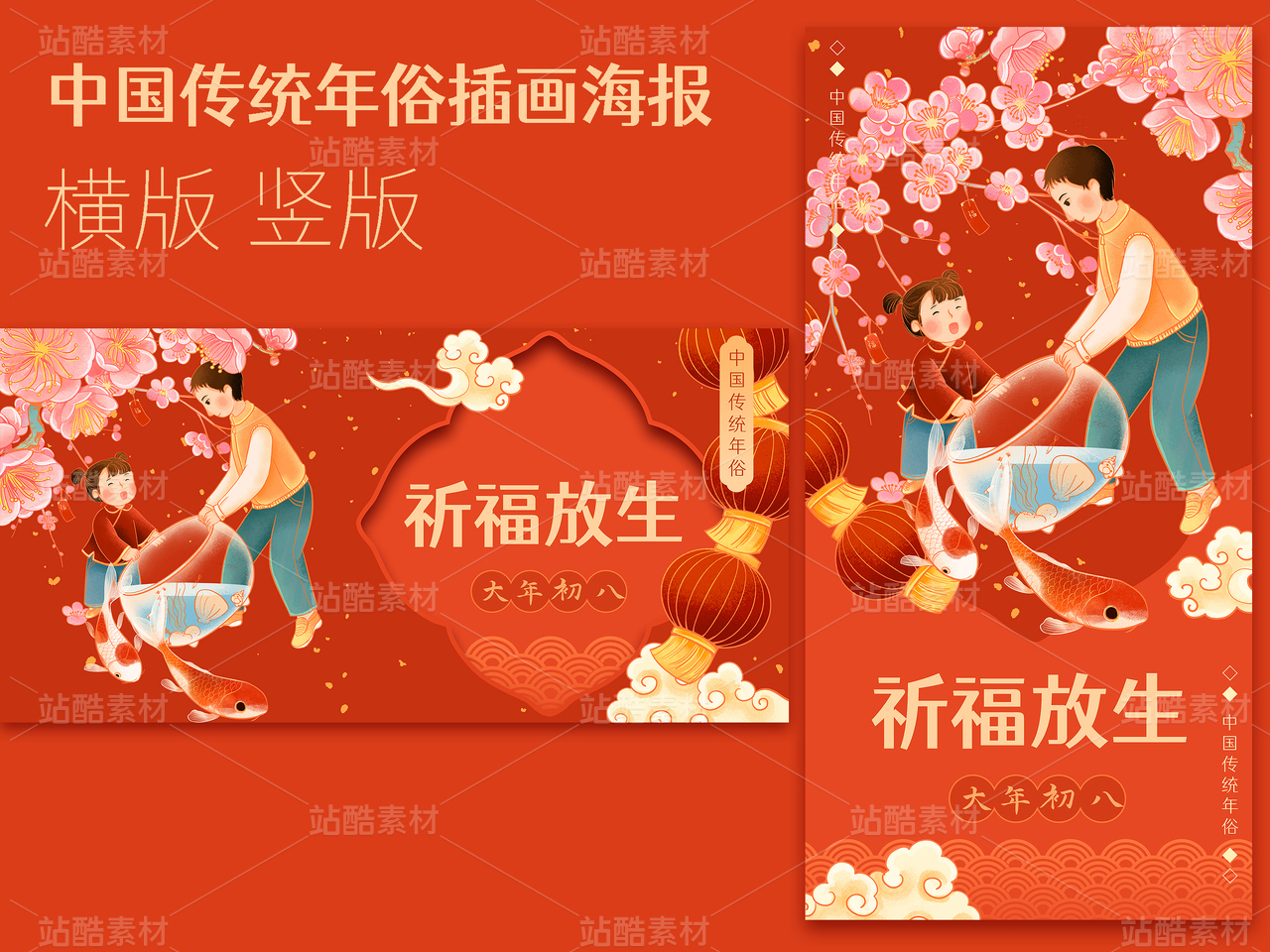 中國傳統(tǒng)年俗大年初八祈福放生插畫