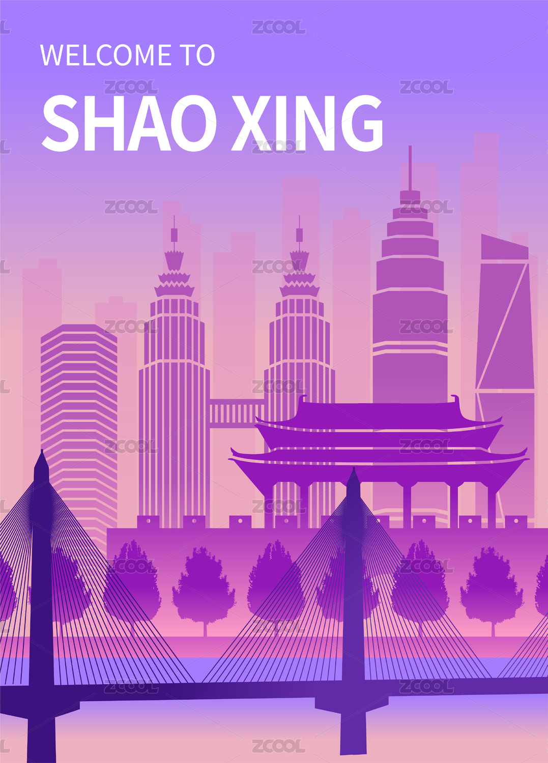 中國浙江省紹興市城市天際線漸變矢量插畫
