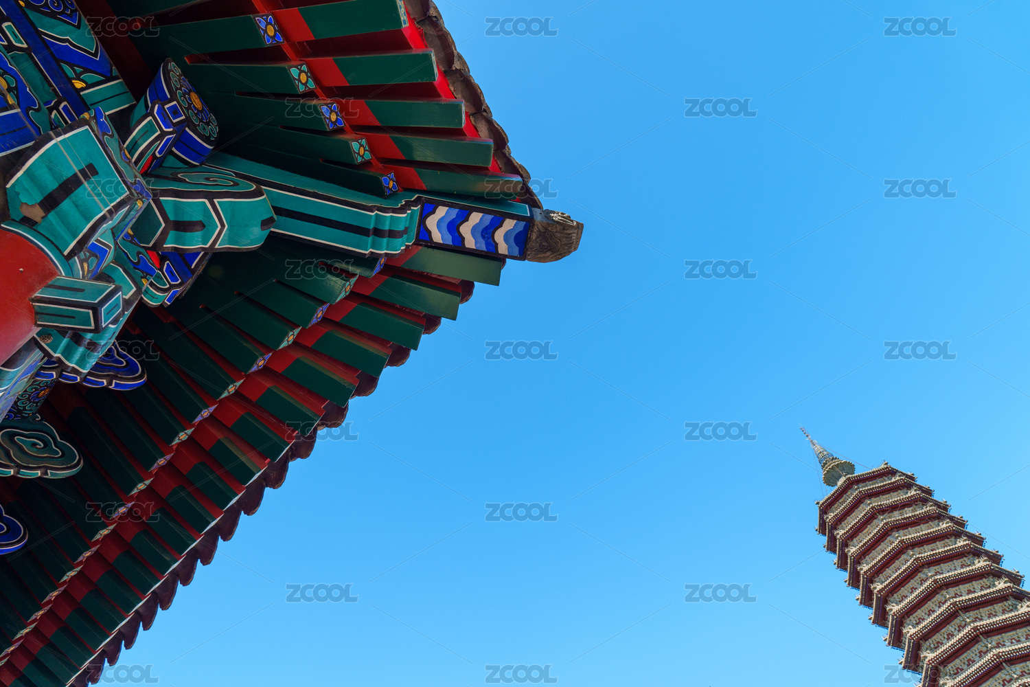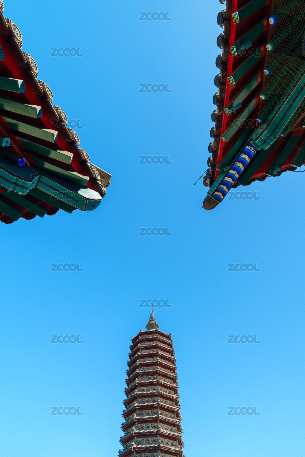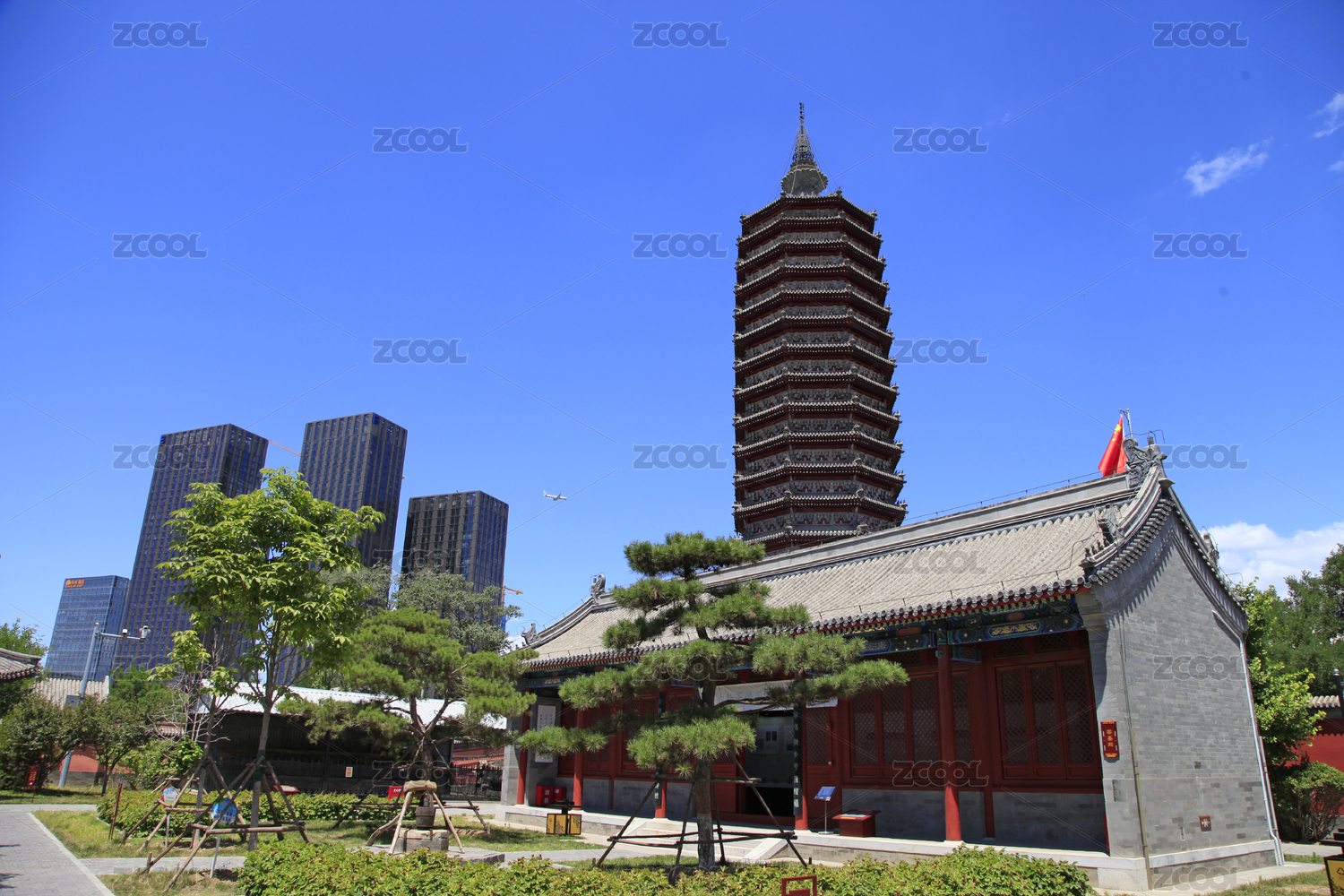 通州三教廟殿宇屋檐與燃燈塔藍天下的構(gòu)圖
