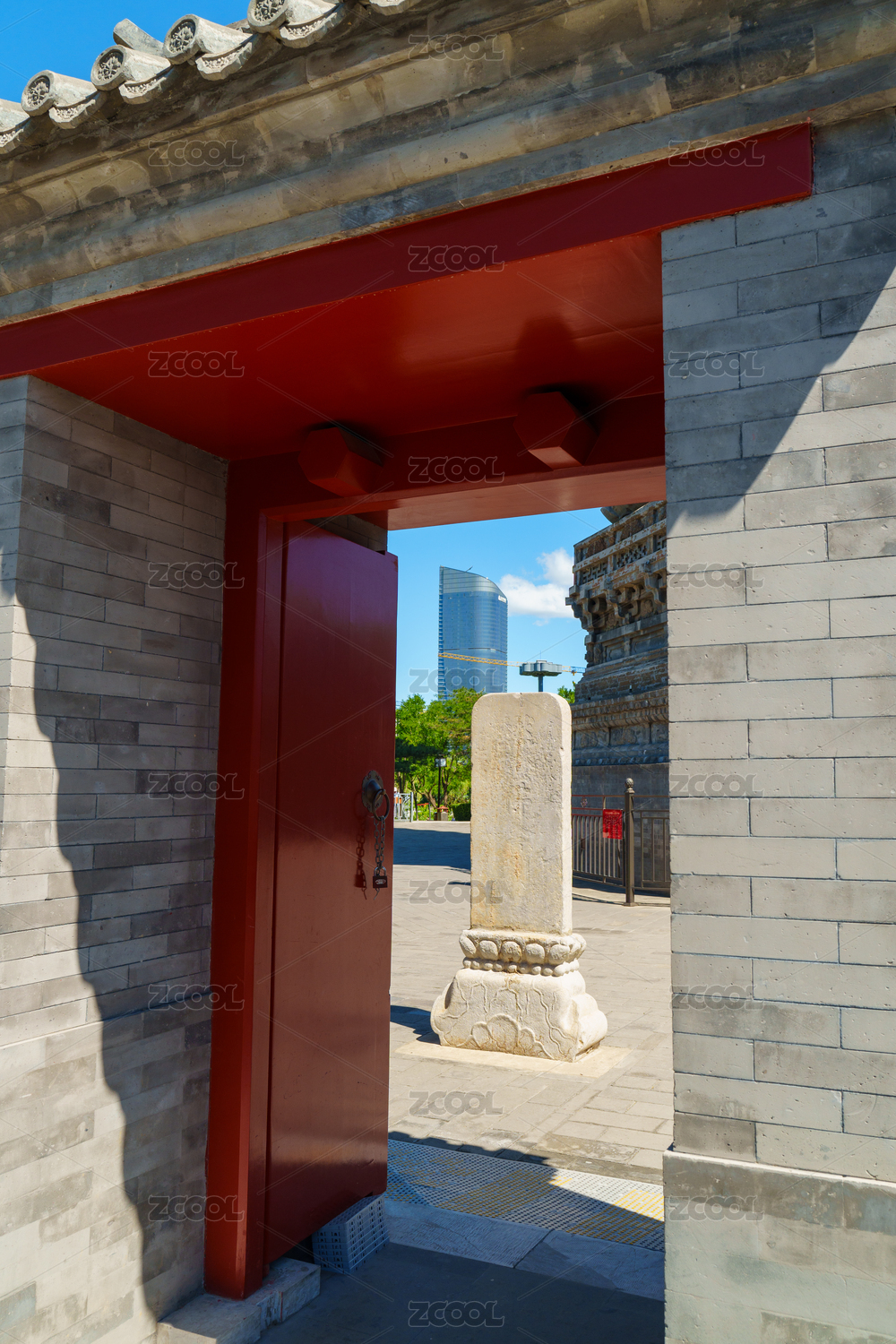 門洞中看到的燃燈塔石碑與遠處的運河商務區(qū)
