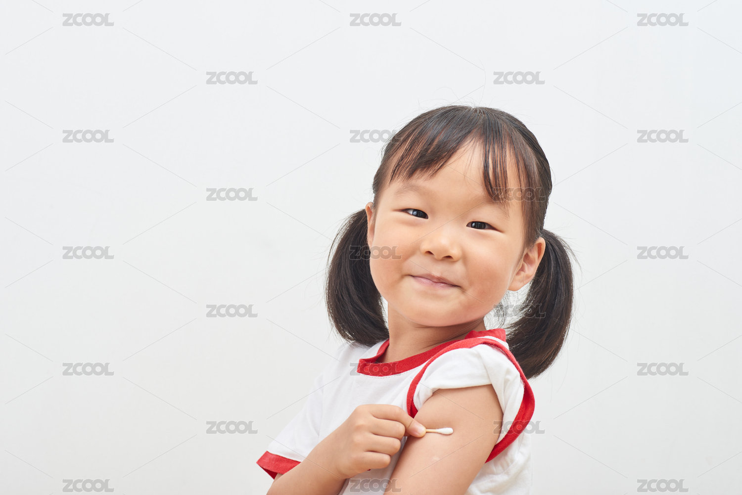 小女孩用棉簽按壓接種疫苗后的胳膊