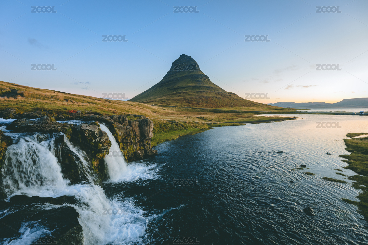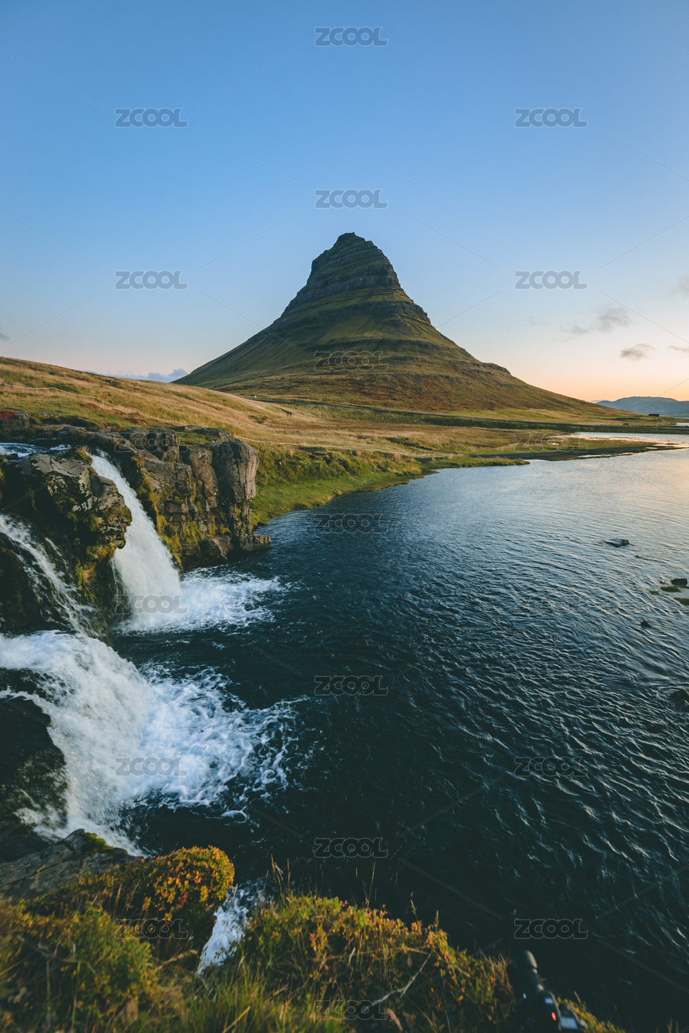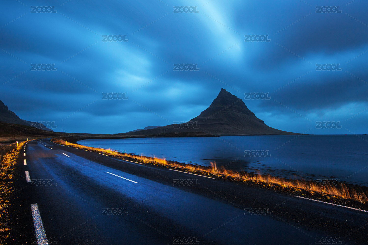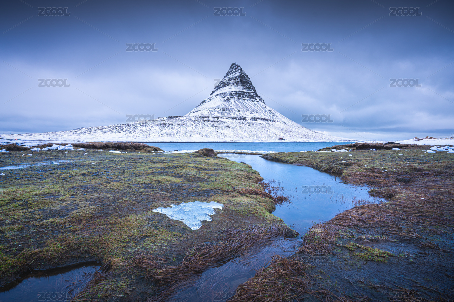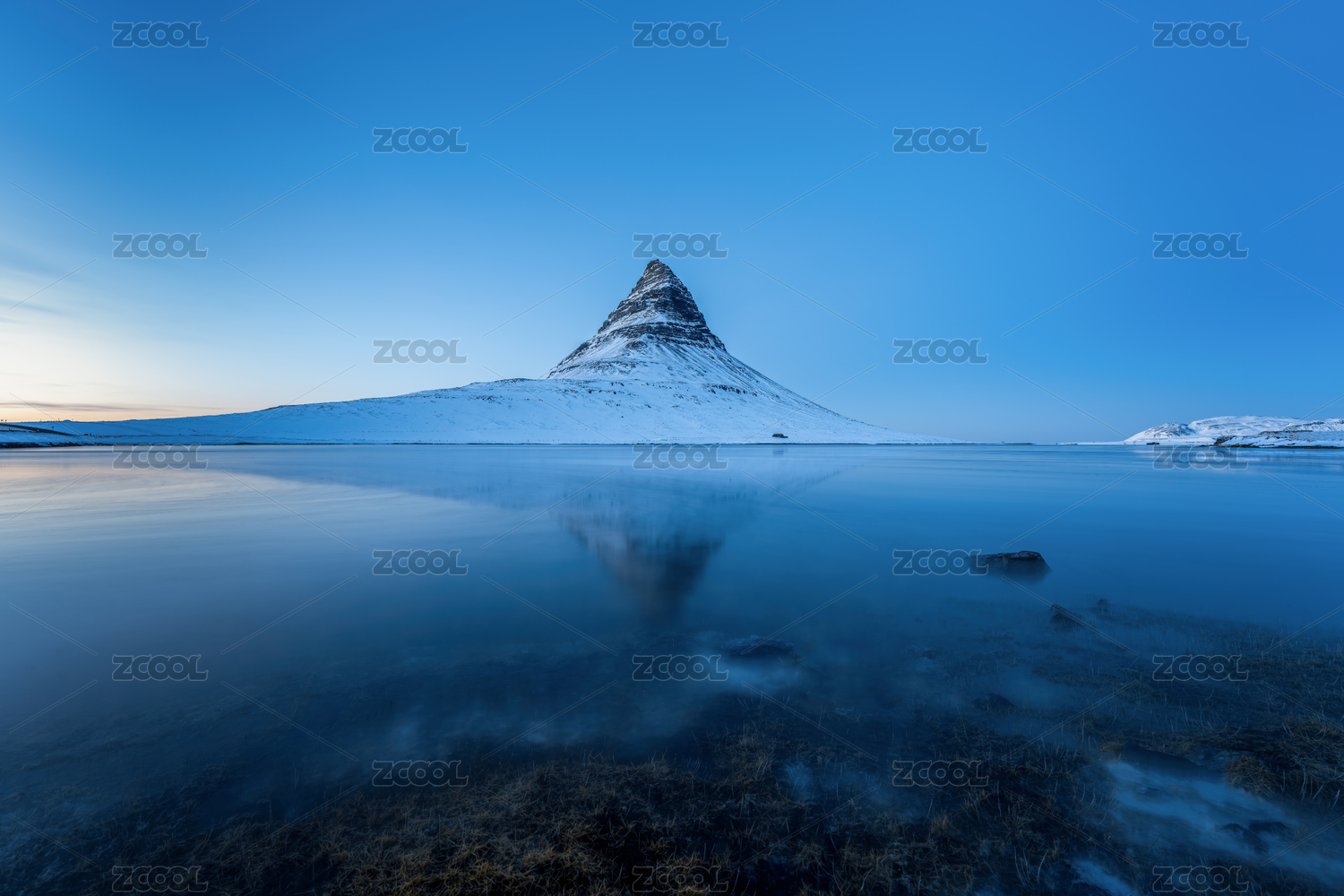 冰島斯奈山半島草帽山日落藍(lán)調(diào)雪山湖泊倒影