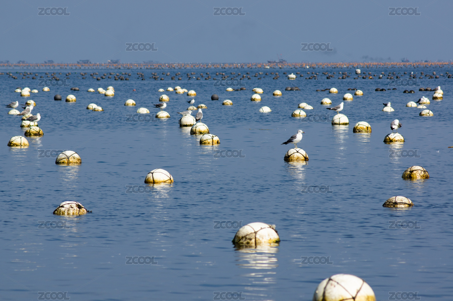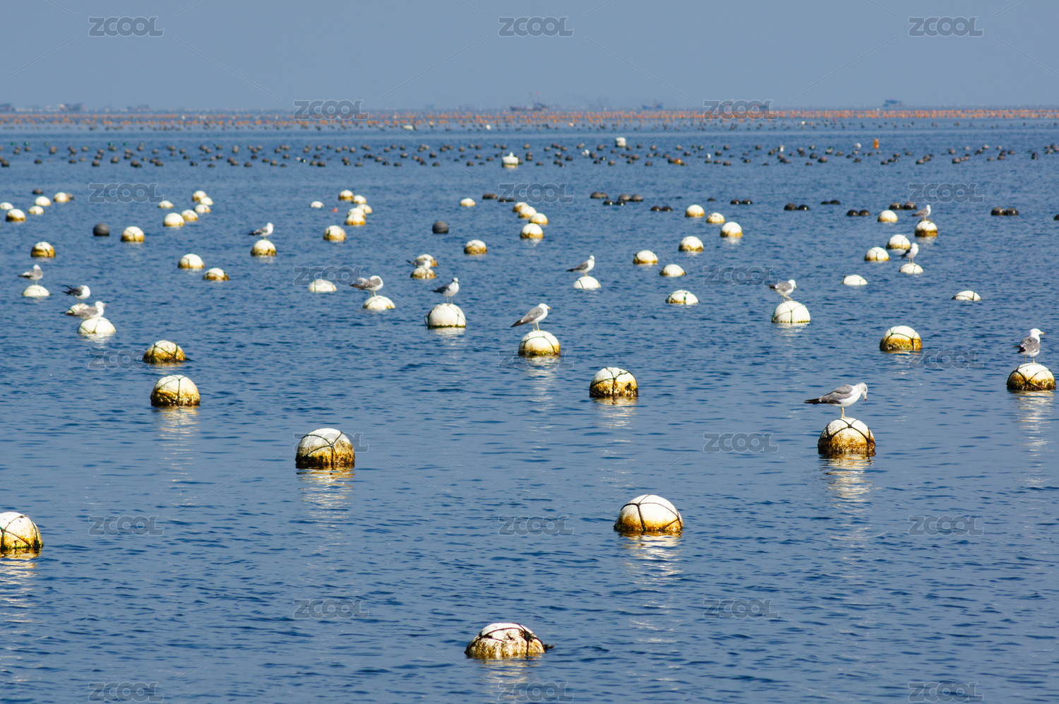 大連小長山島海上養(yǎng)殖場的浮標(biāo)上站立著海鷗
