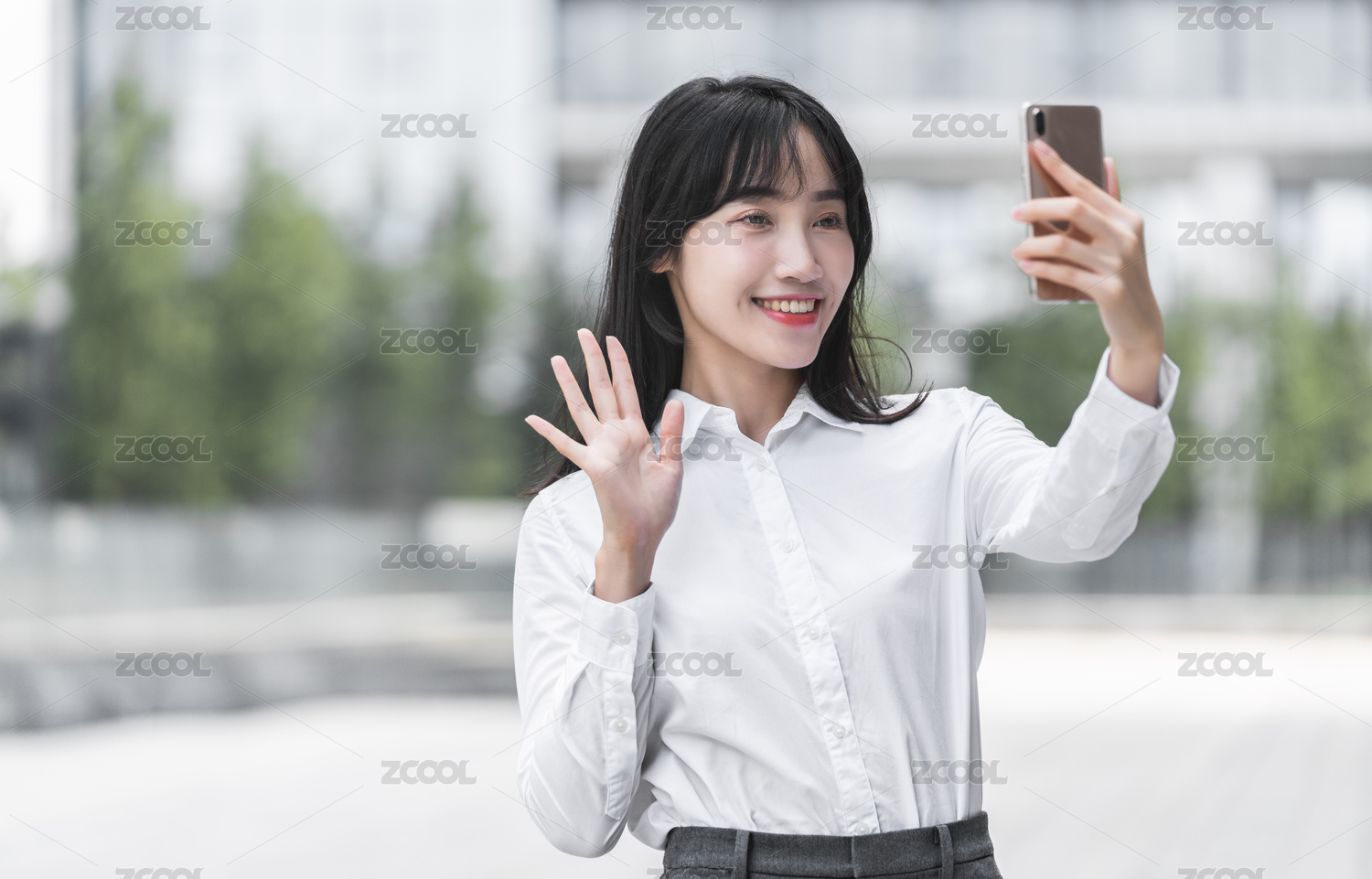 商務(wù)女性靠著欄桿用手機(jī)自拍