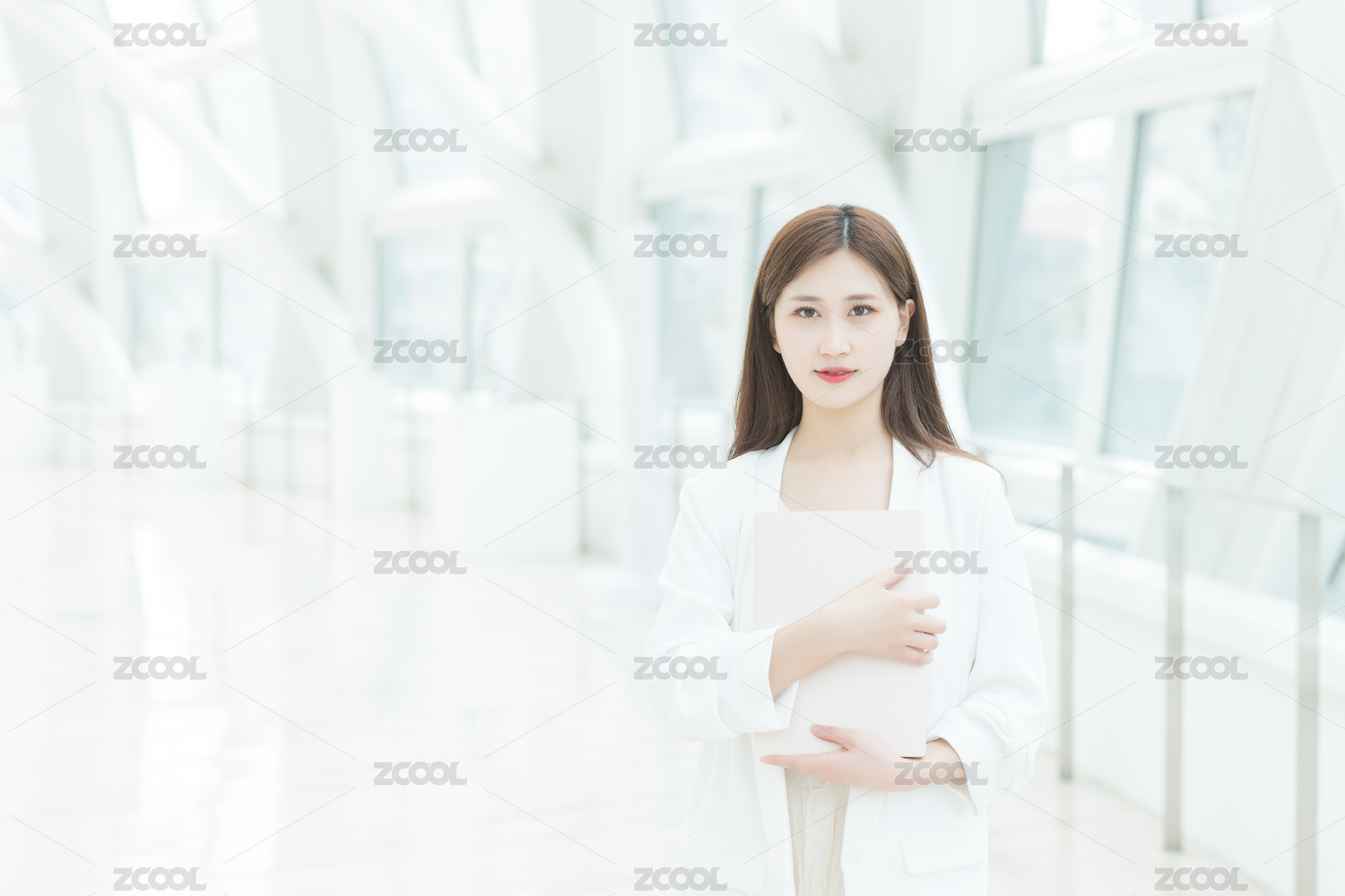 在白色背景下年輕的商務(wù)女性拿著文件夾