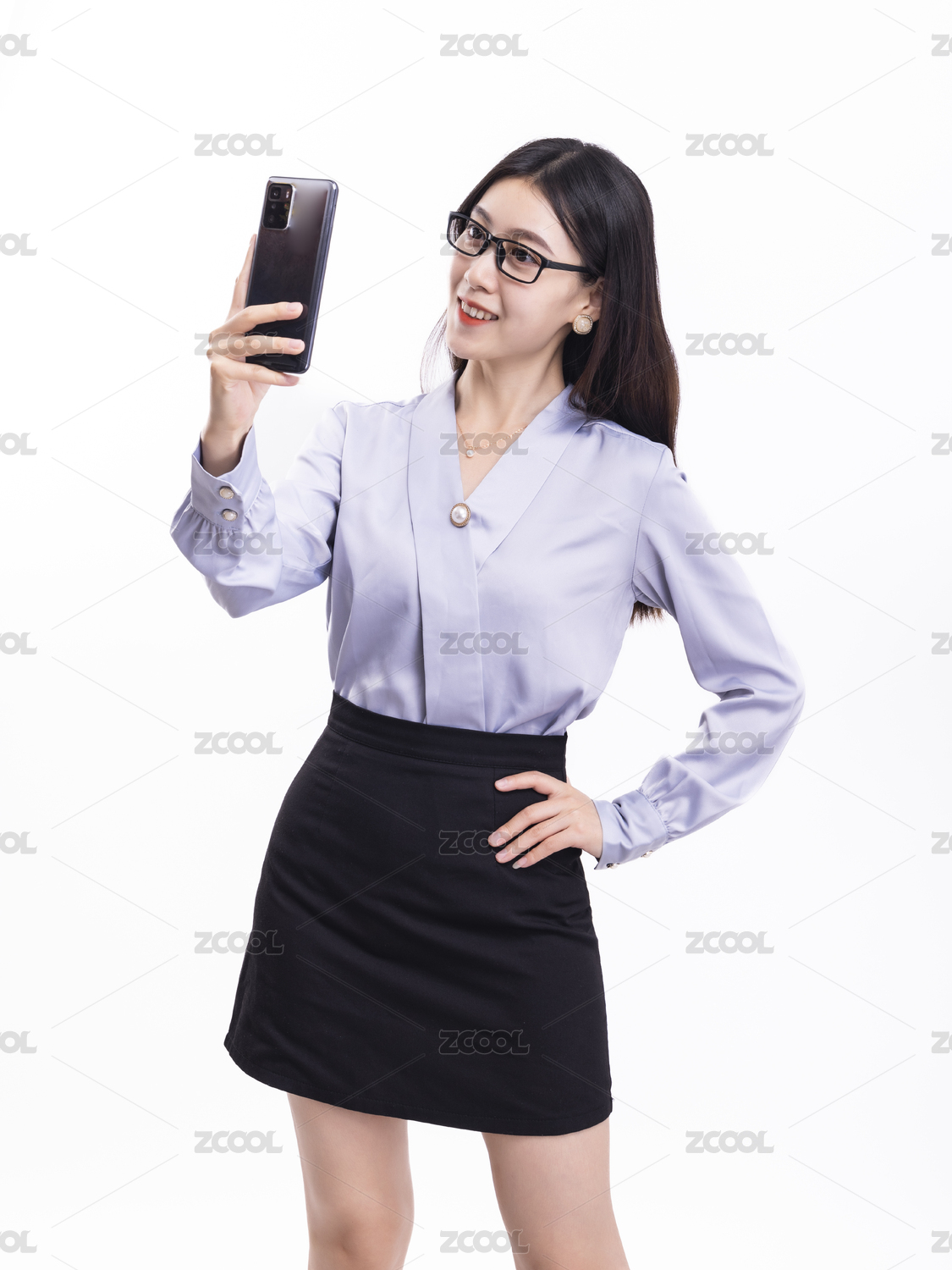 白色背景下穿著黑色短裙拿著手機(jī)的商務(wù)女性
