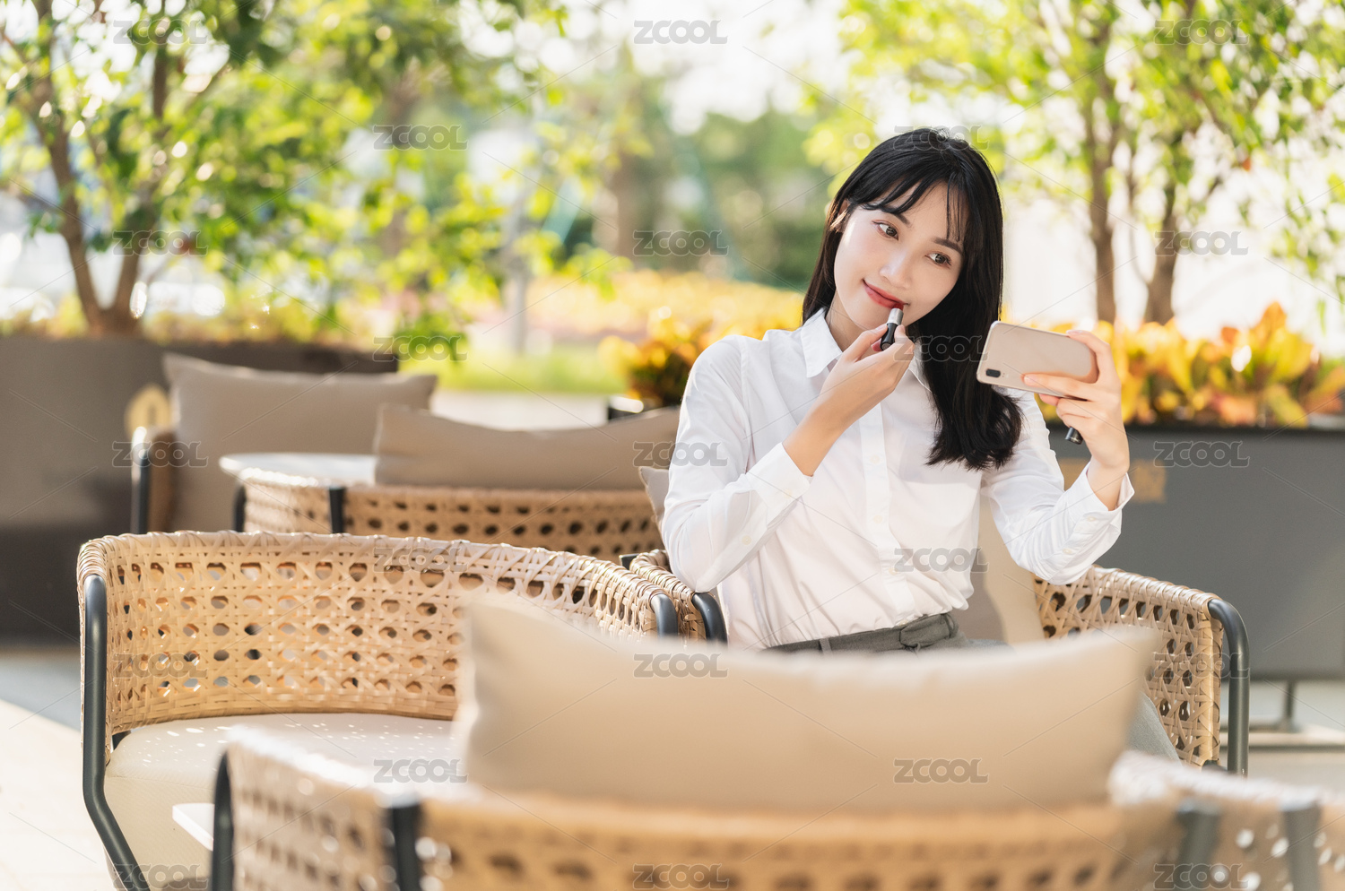 商務(wù)女性坐在室外對著手機(jī)補(bǔ)口紅