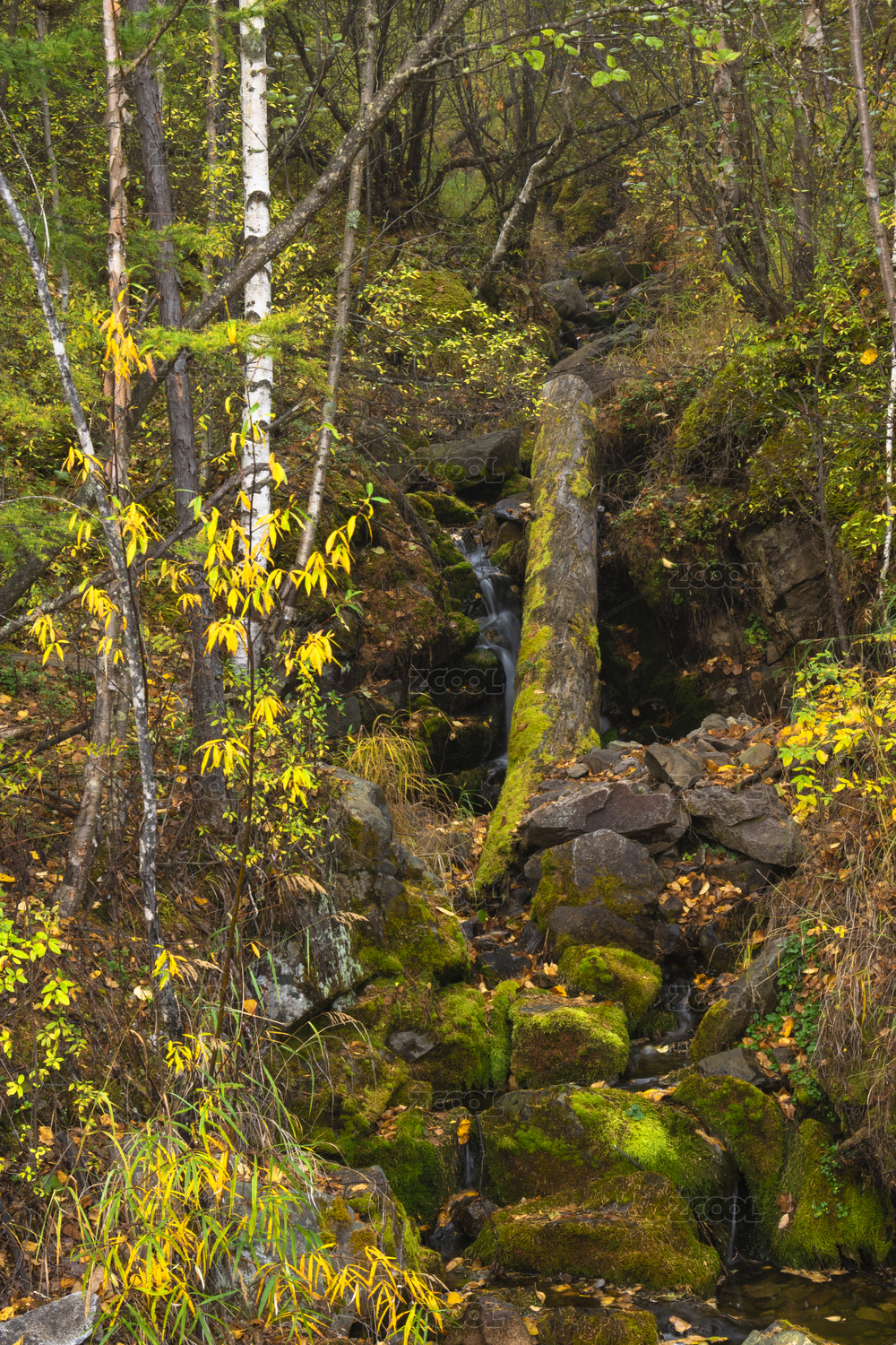 中國大興安嶺秋季密林中的苔蘚和溪水