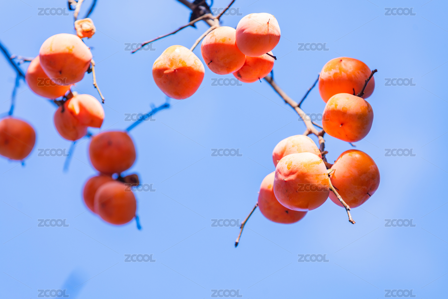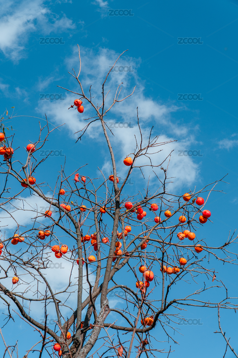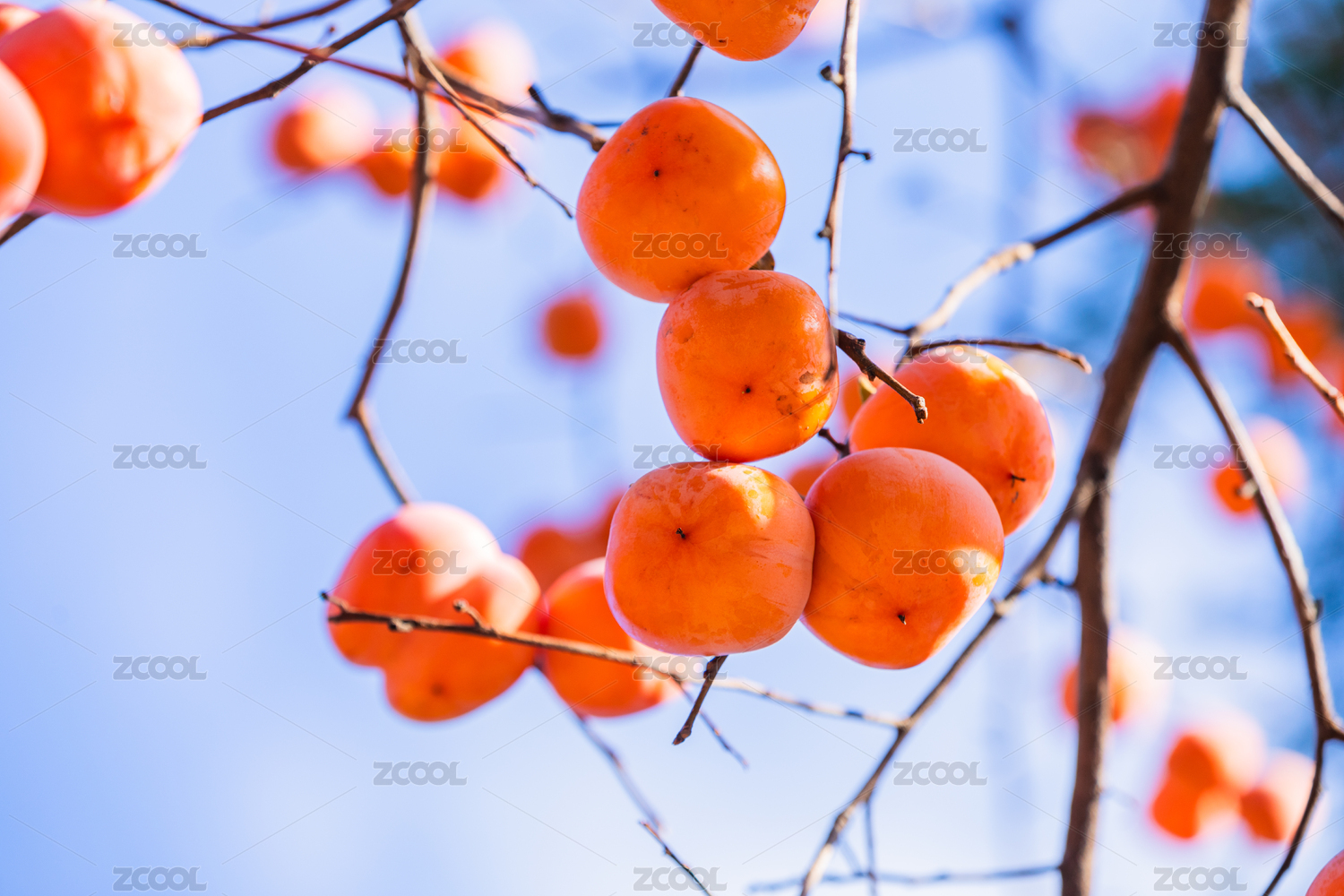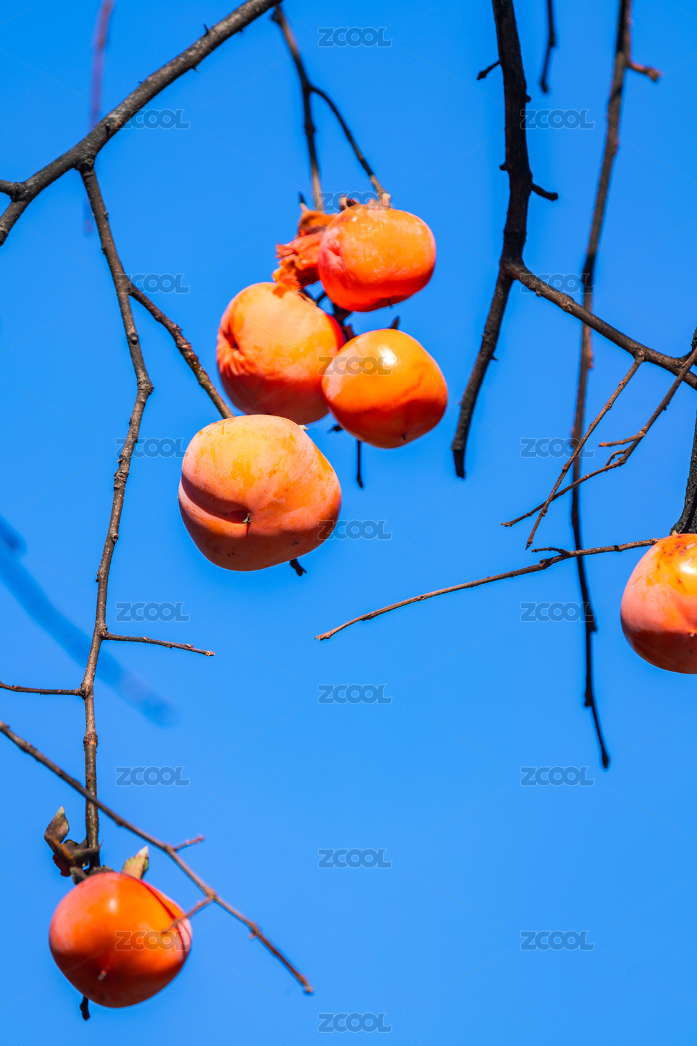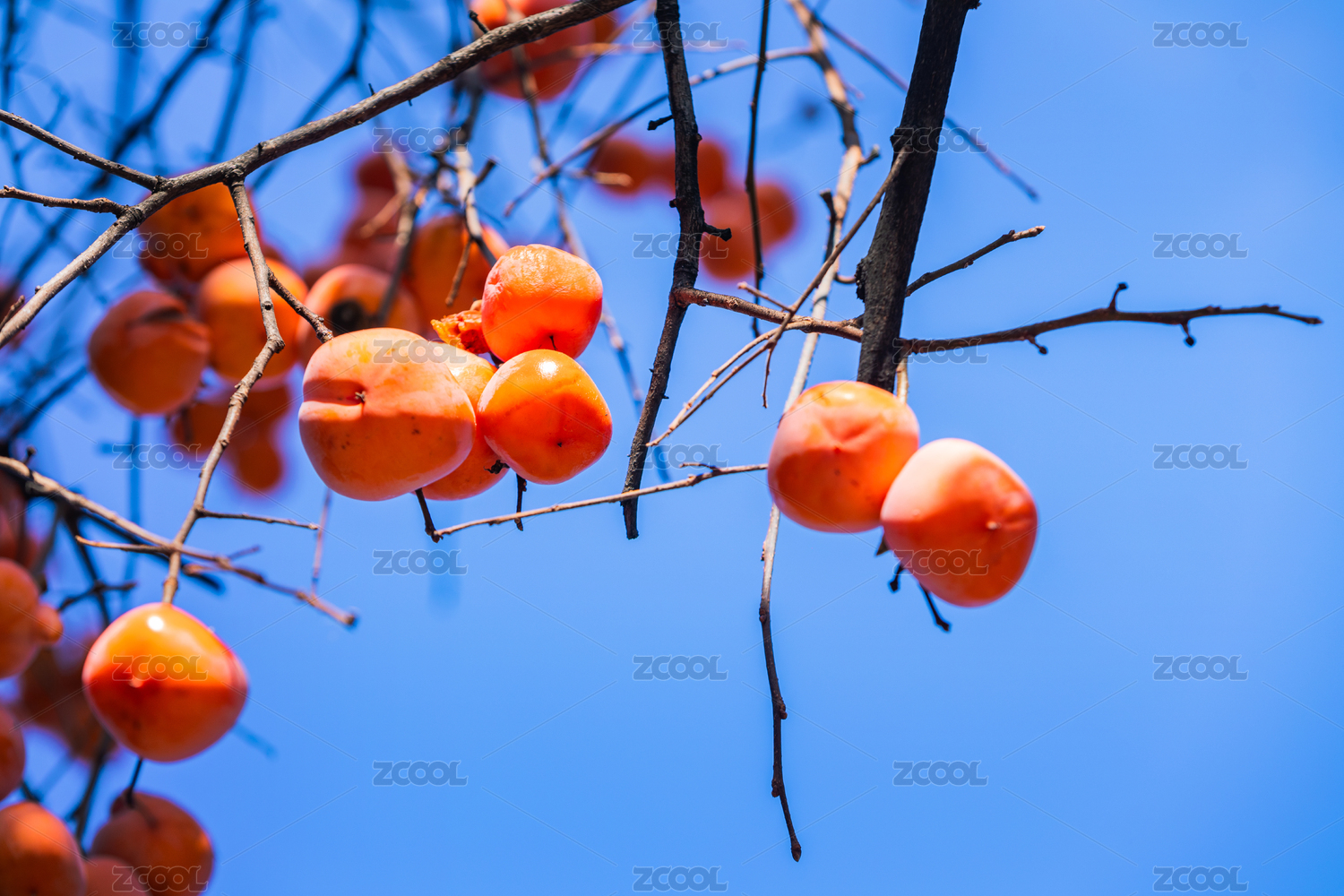 盛開桃花下木桌上放著一筐秋季水果紅柿