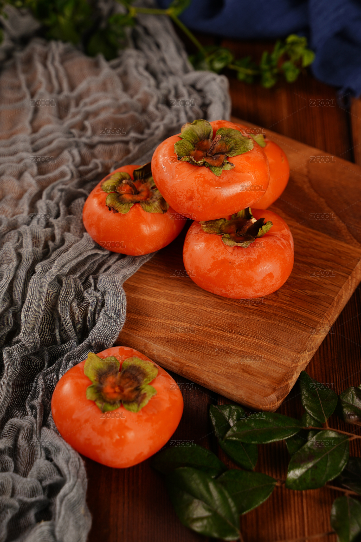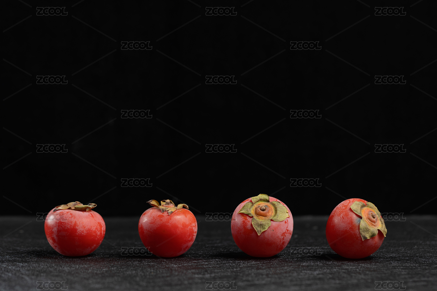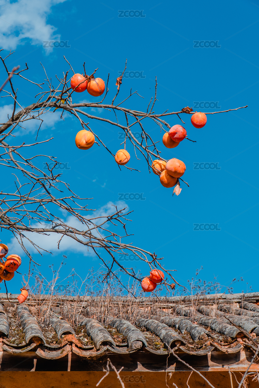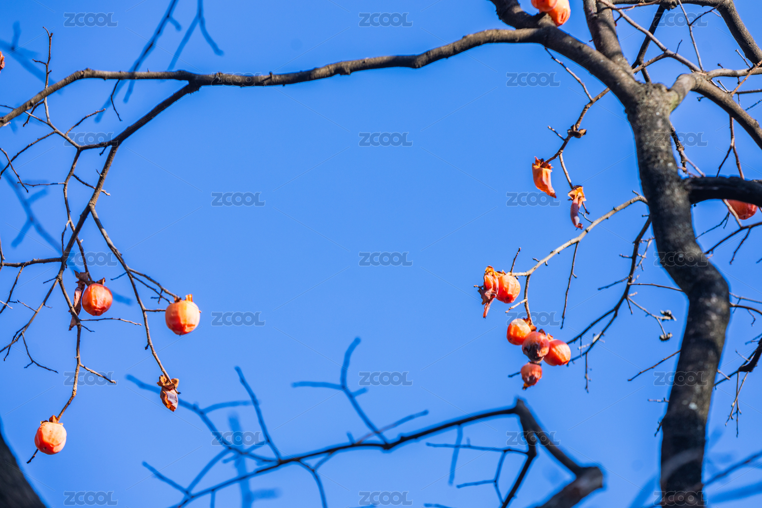 盛開桃花下木桌上放著一筐秋季水果紅柿