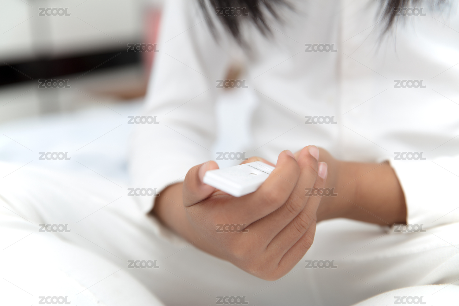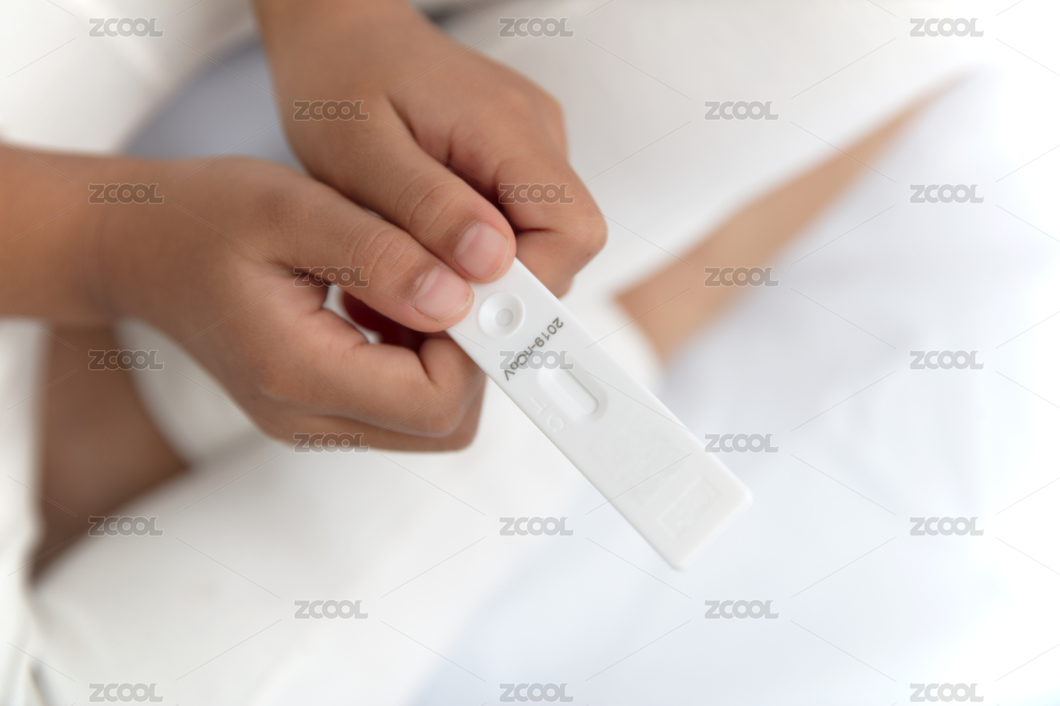 床上的小女孩手拿新冠抗原試劑盒