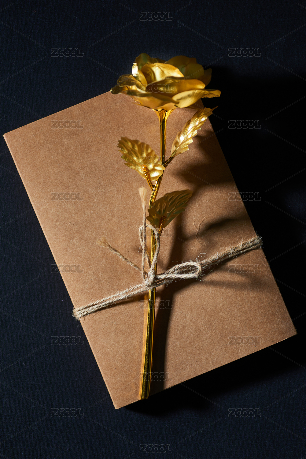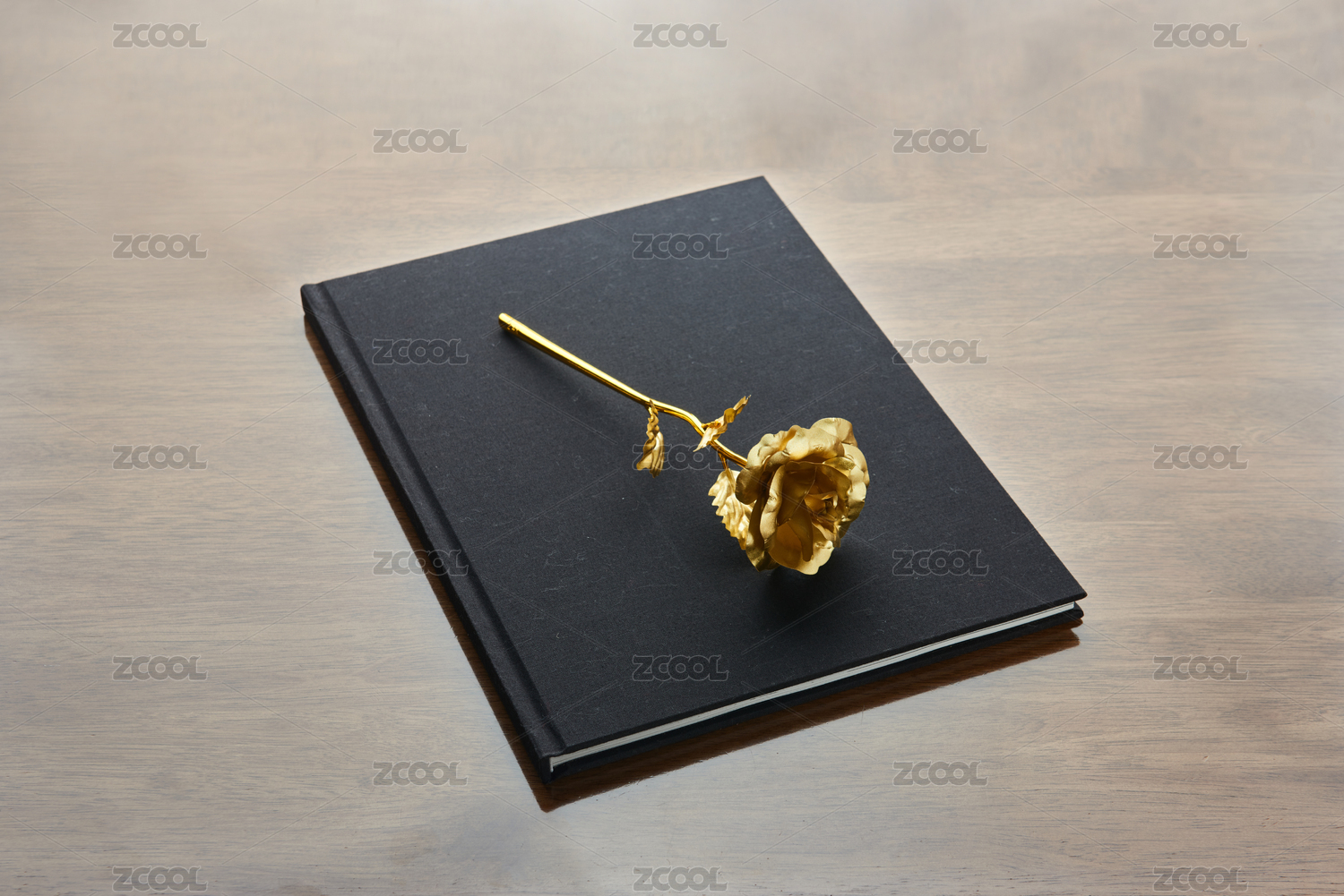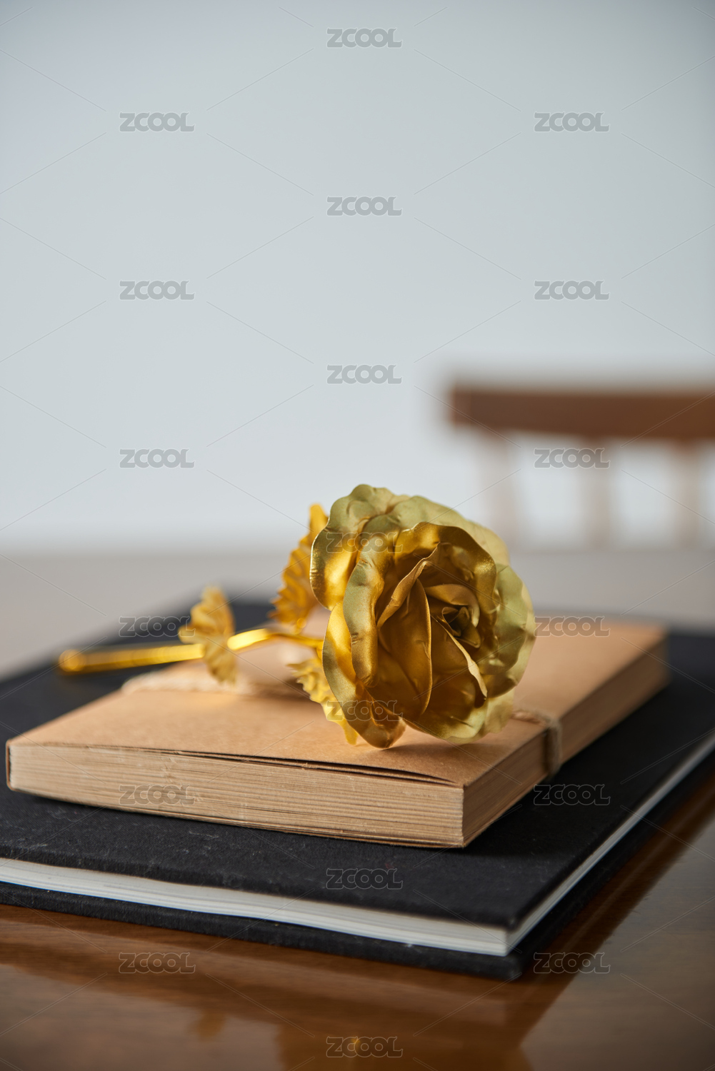 精裝書和一支綻放的鍍金玫瑰花