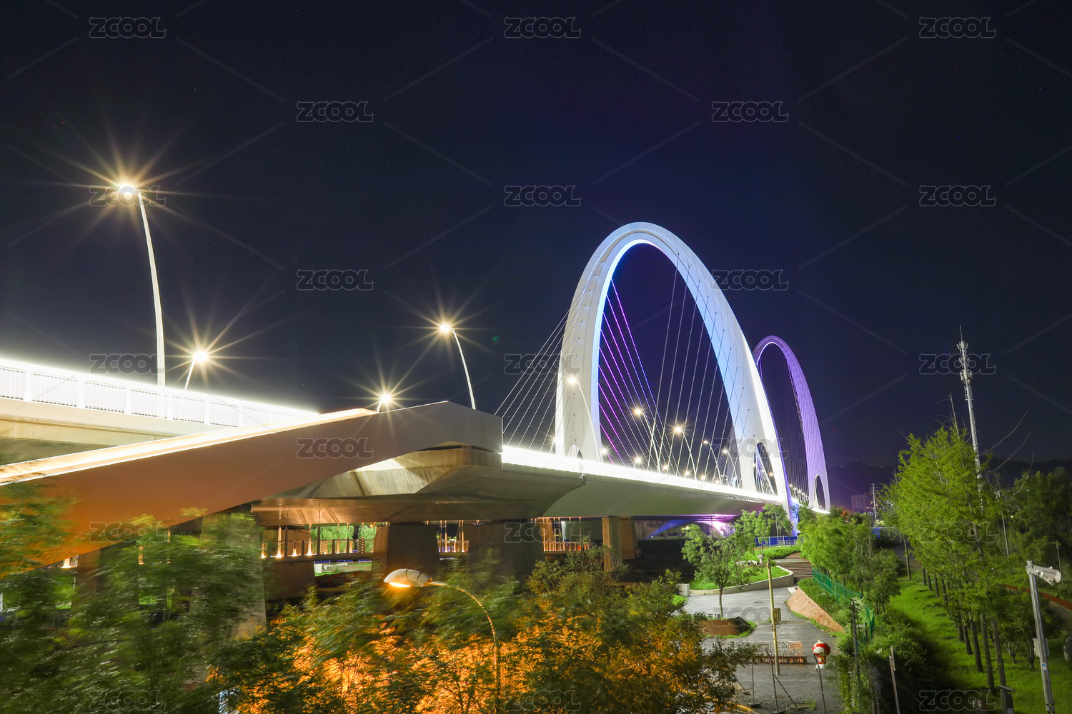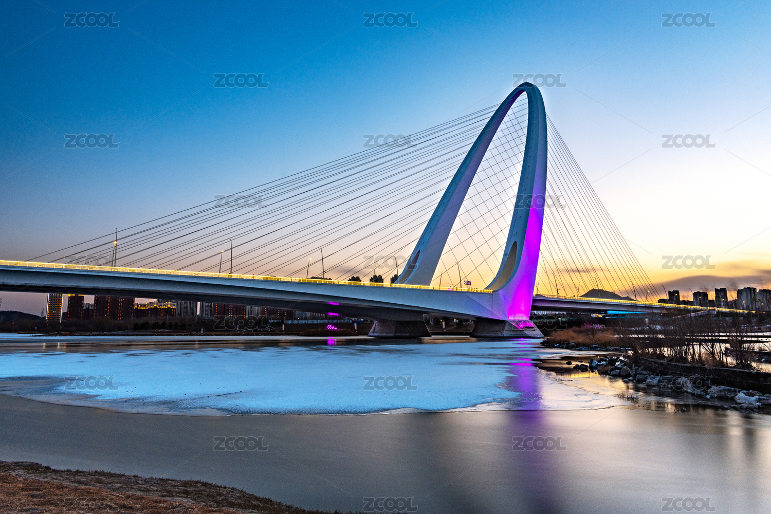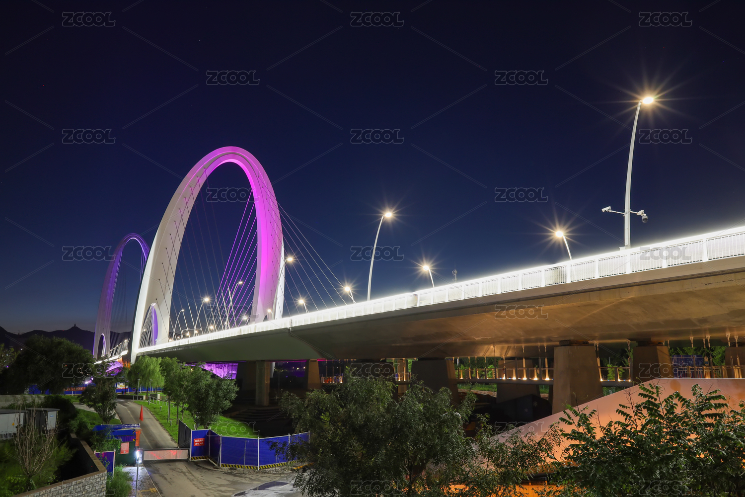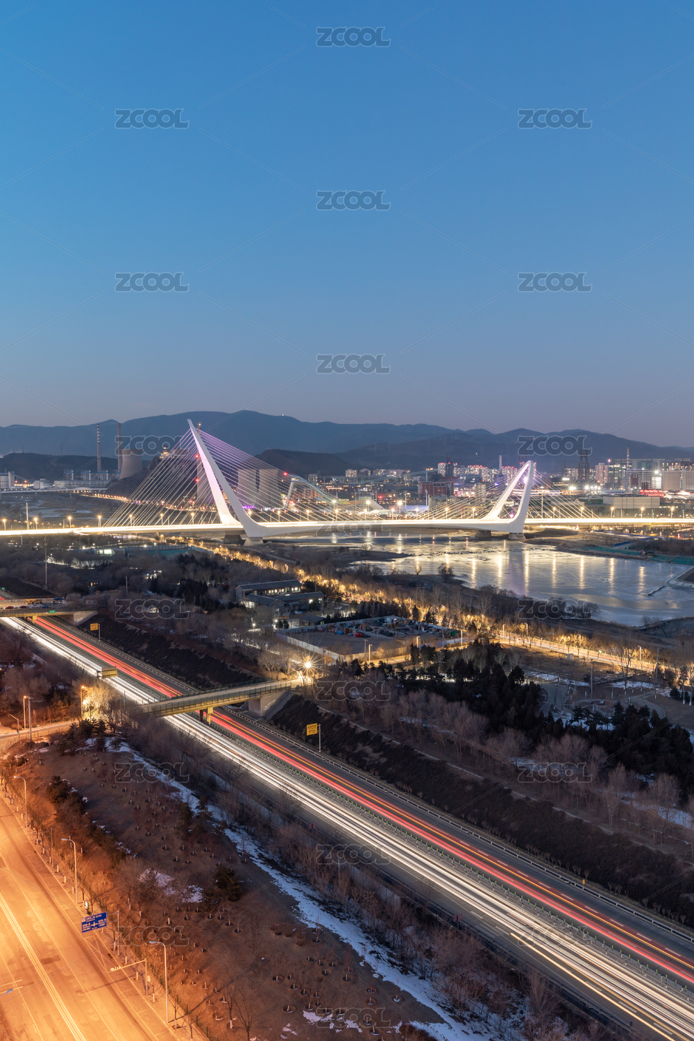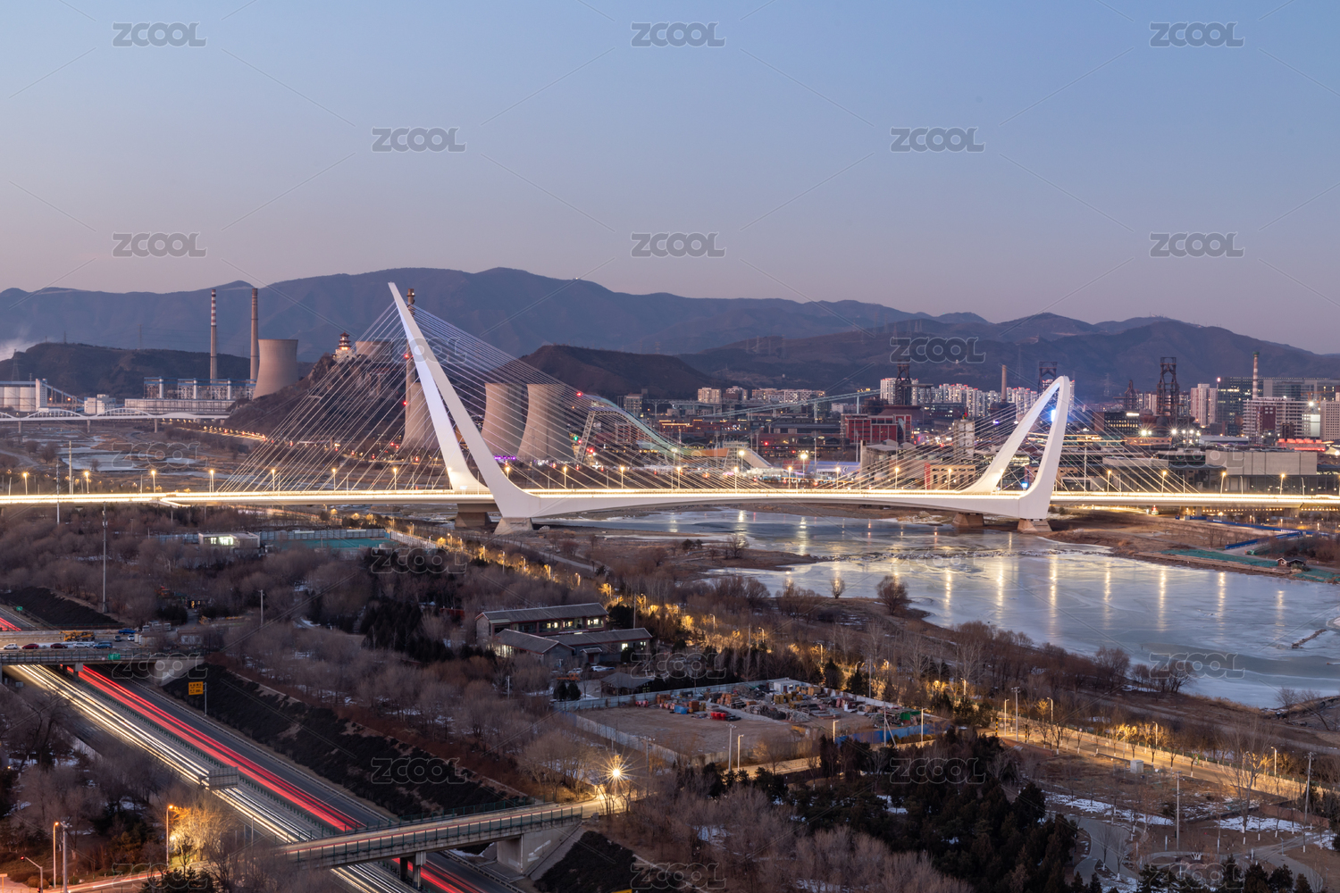 北京門頭溝區(qū)新首鋼大橋日落夜景