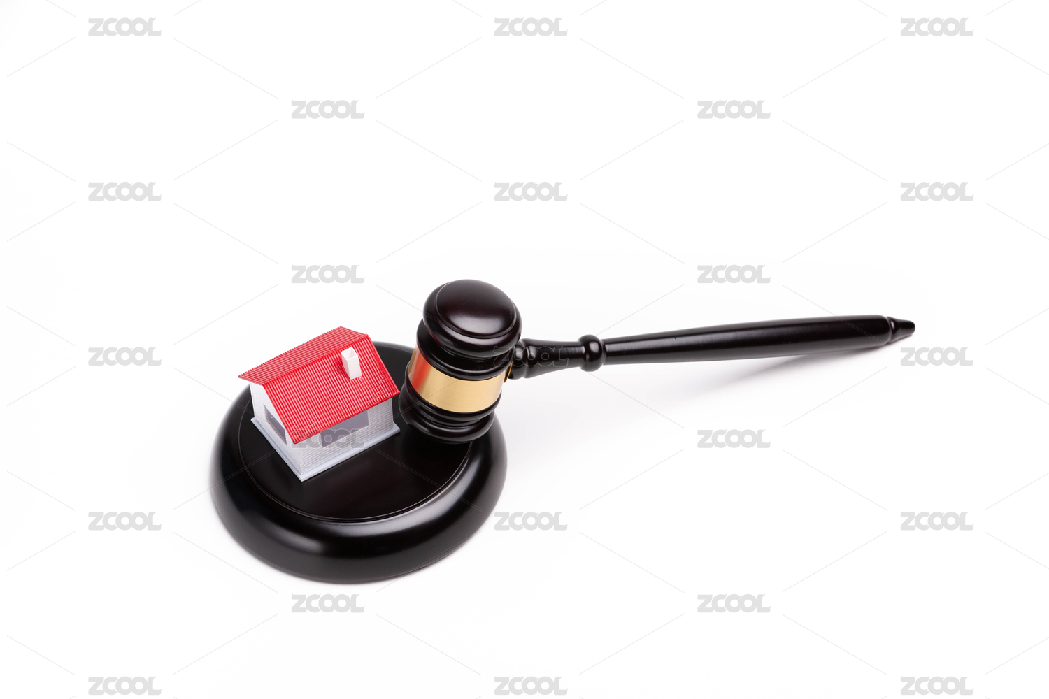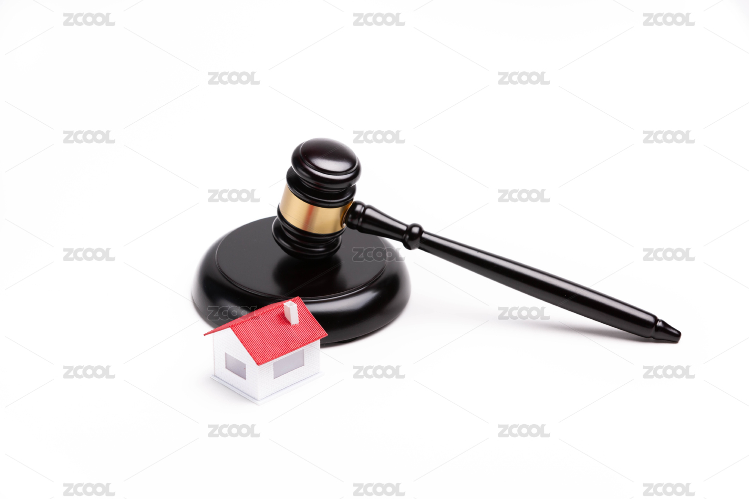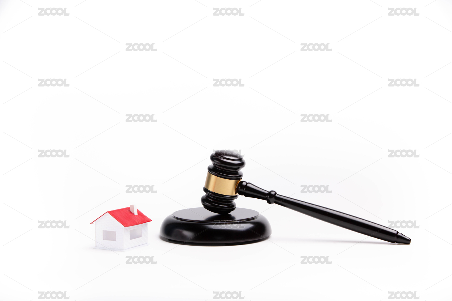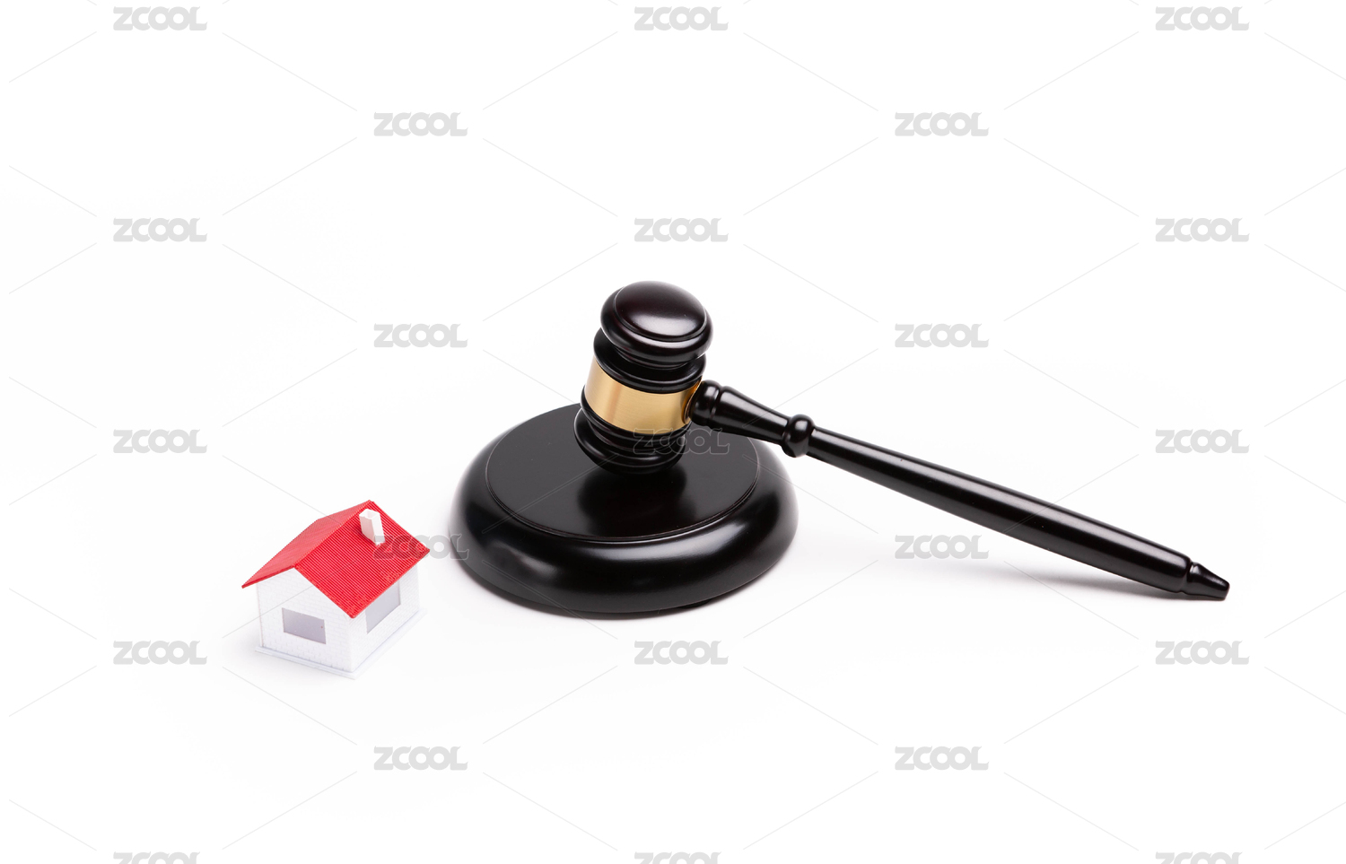 白色背景下的法官錘和紅色房子