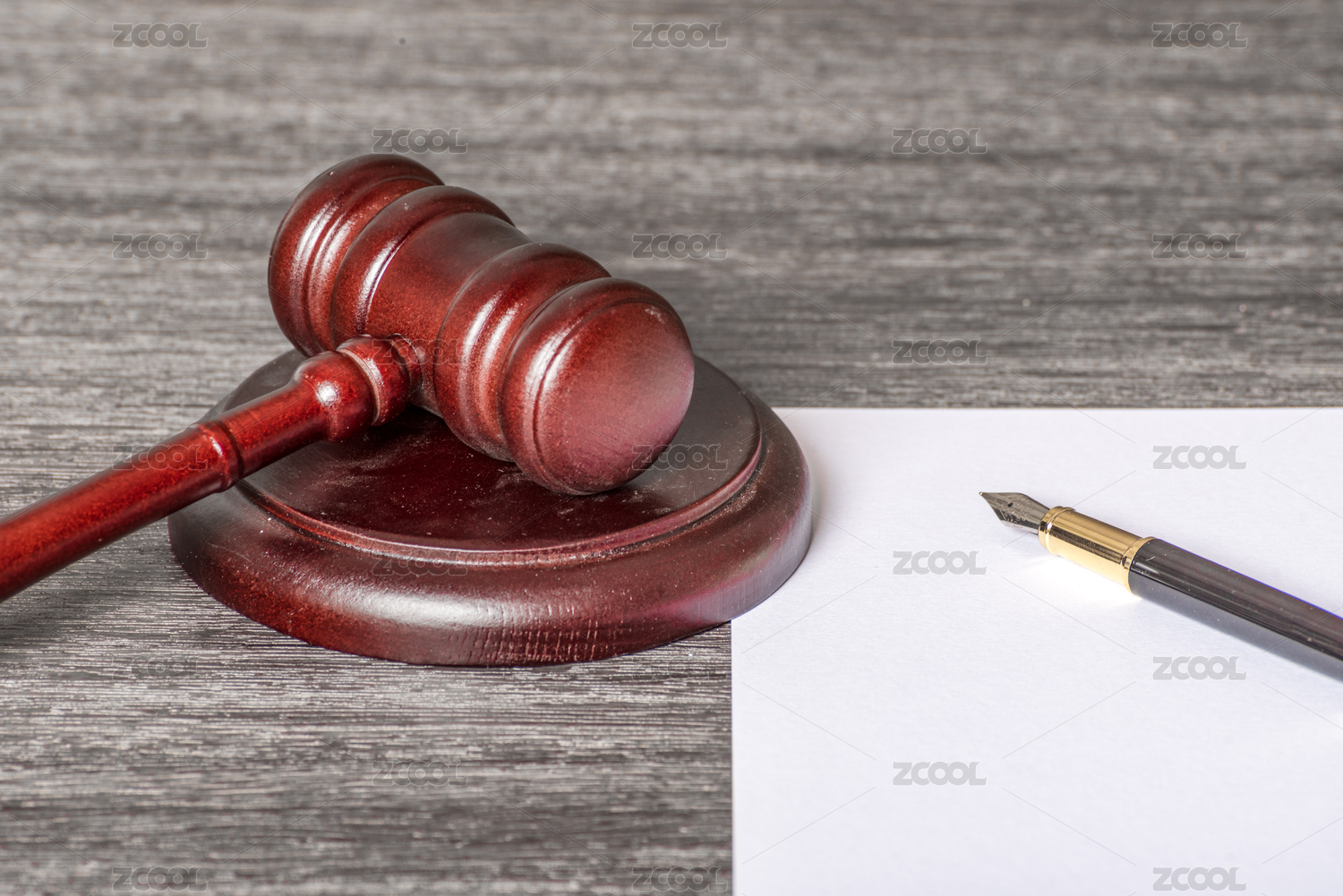 法官錘與放在審判紙上的鋼筆