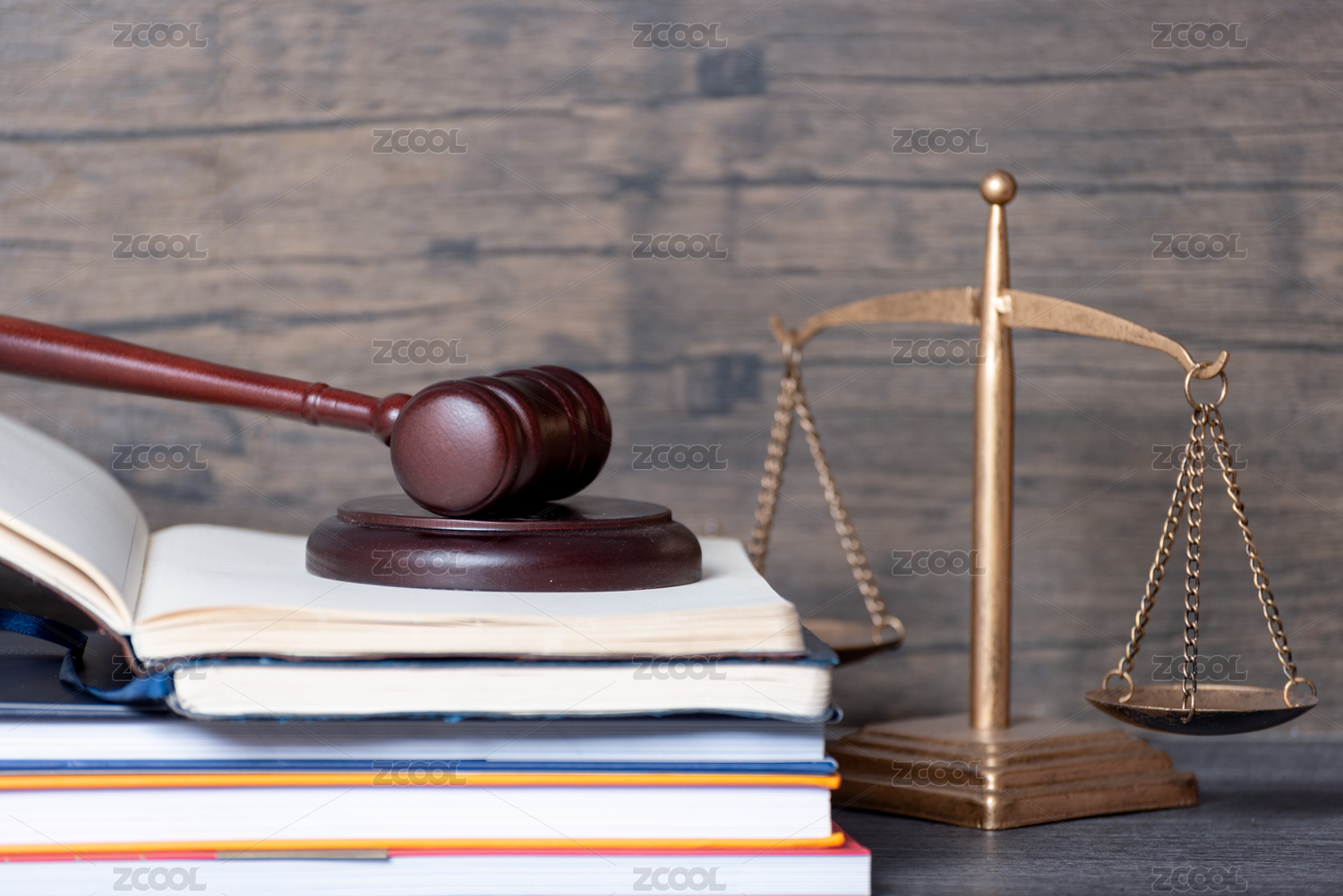 放在一堆書(shū)籍上的法官錘與天平