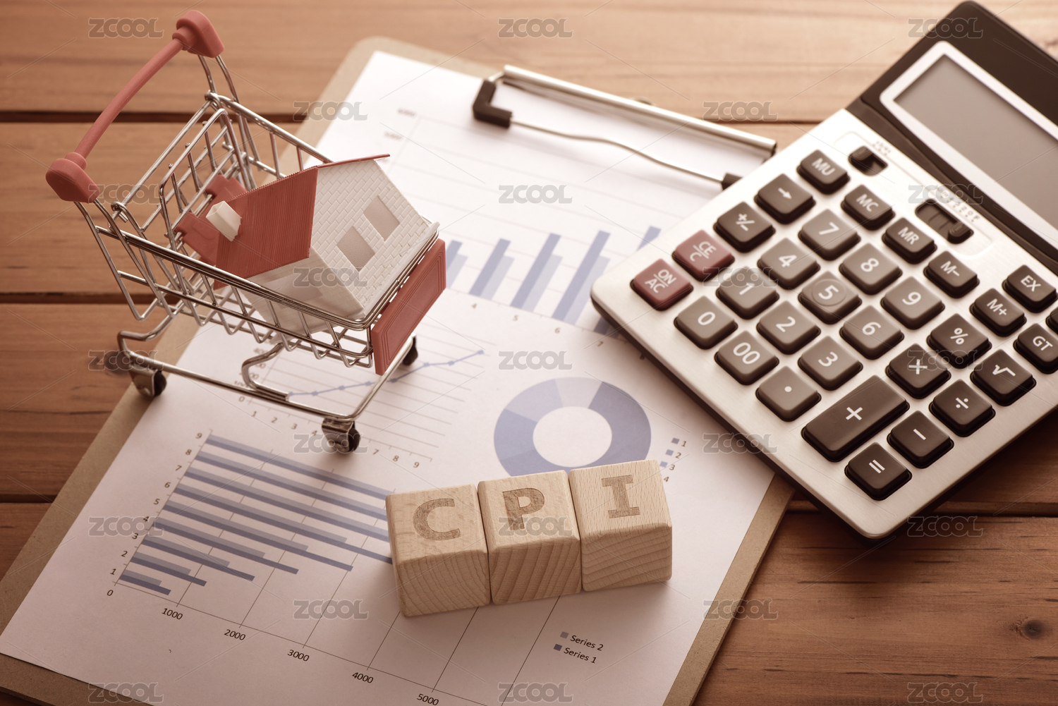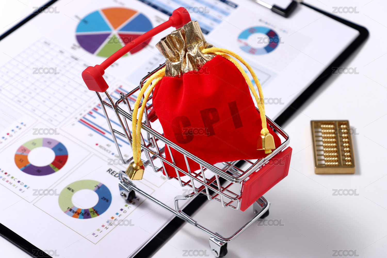 圖表上的文字積木CPI和購(gòu)物車(chē)?yán)锏男》孔?/div>