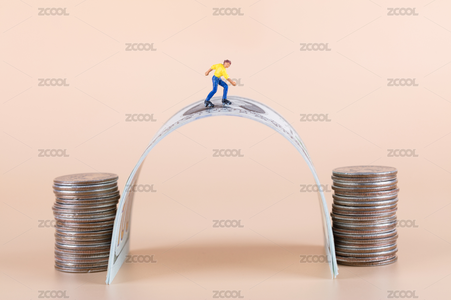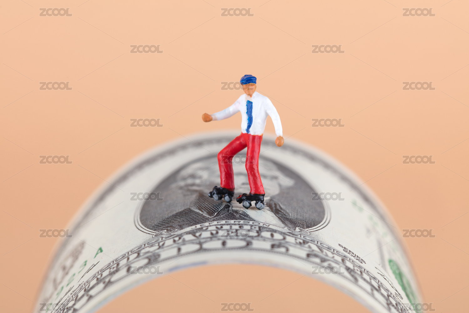 美元鈔票橋拱上滑旱冰的人偶