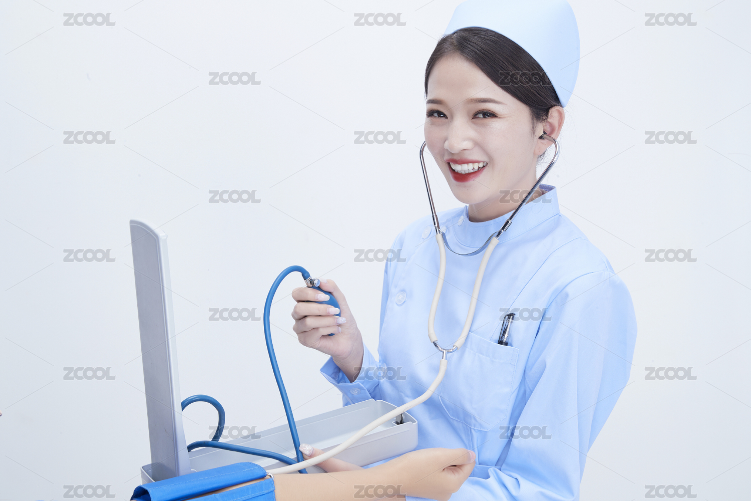 手拿血壓測量儀為患者診治量血壓的女性護(hù)士