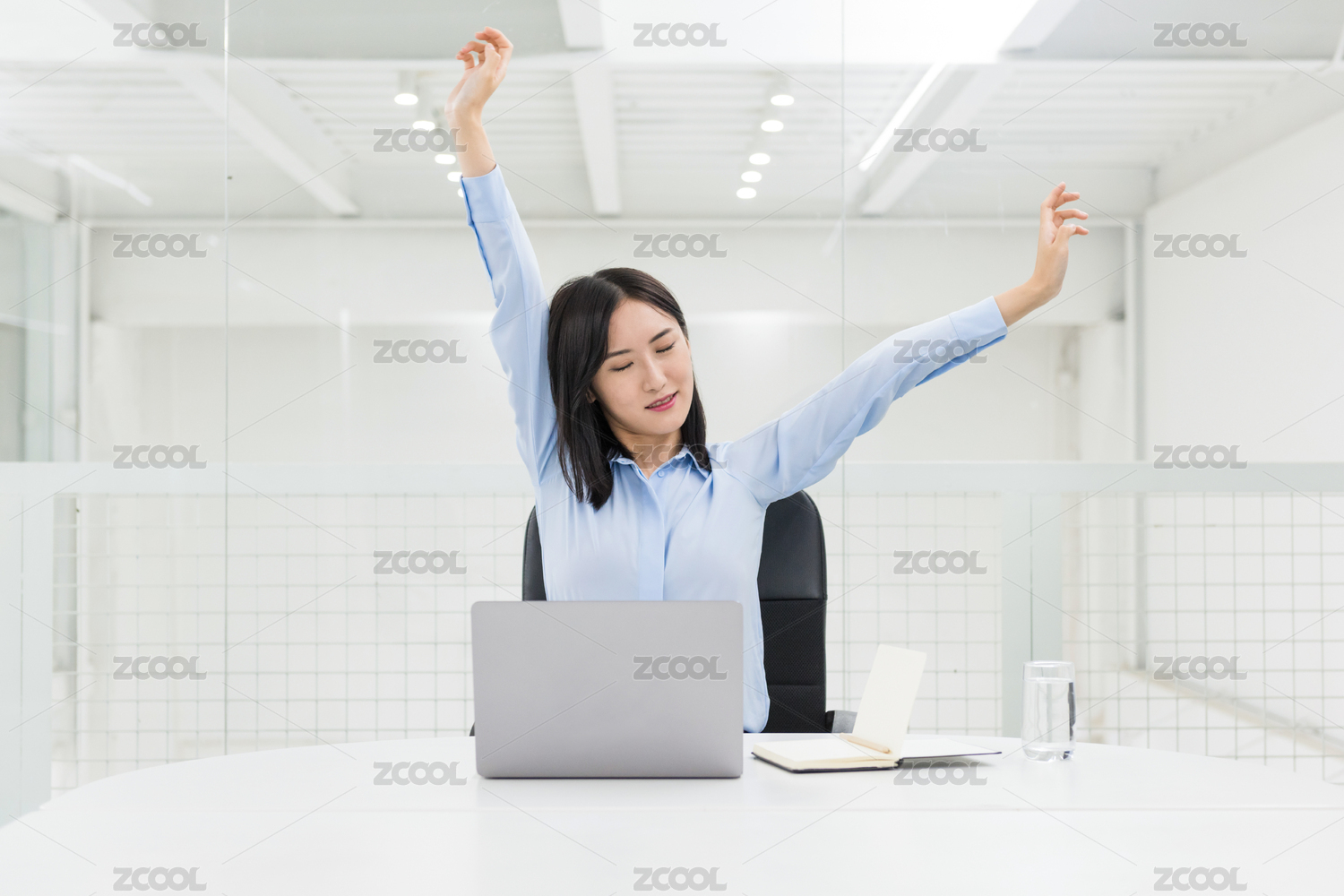 在辦公室伸懶腰的亞洲職業(yè)女性