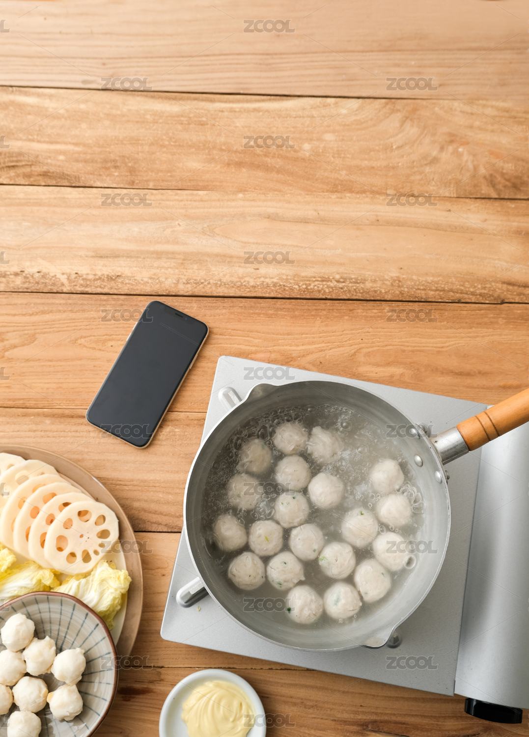 木頭餐桌上火鍋里的海鮮鲅魚丸子