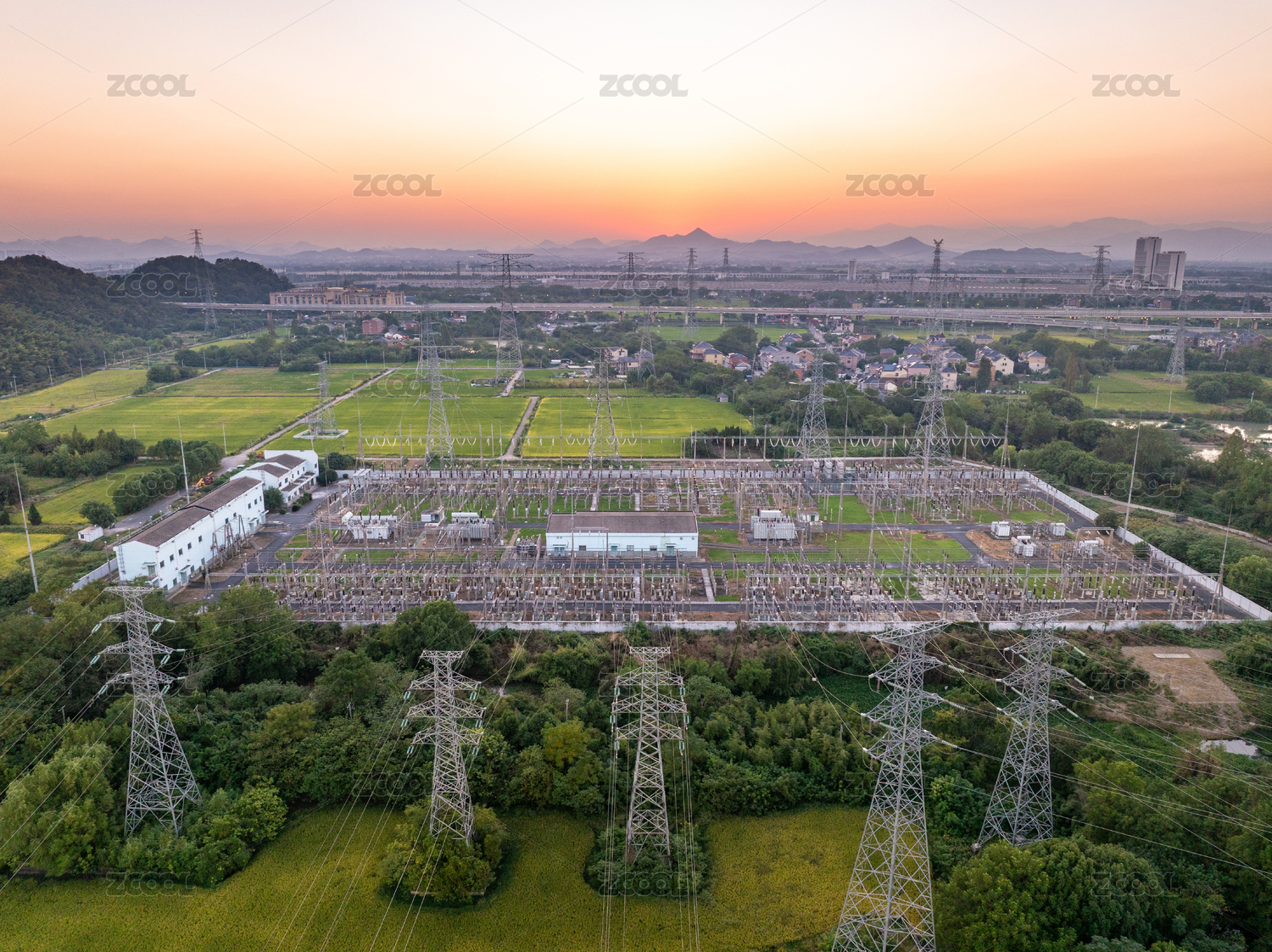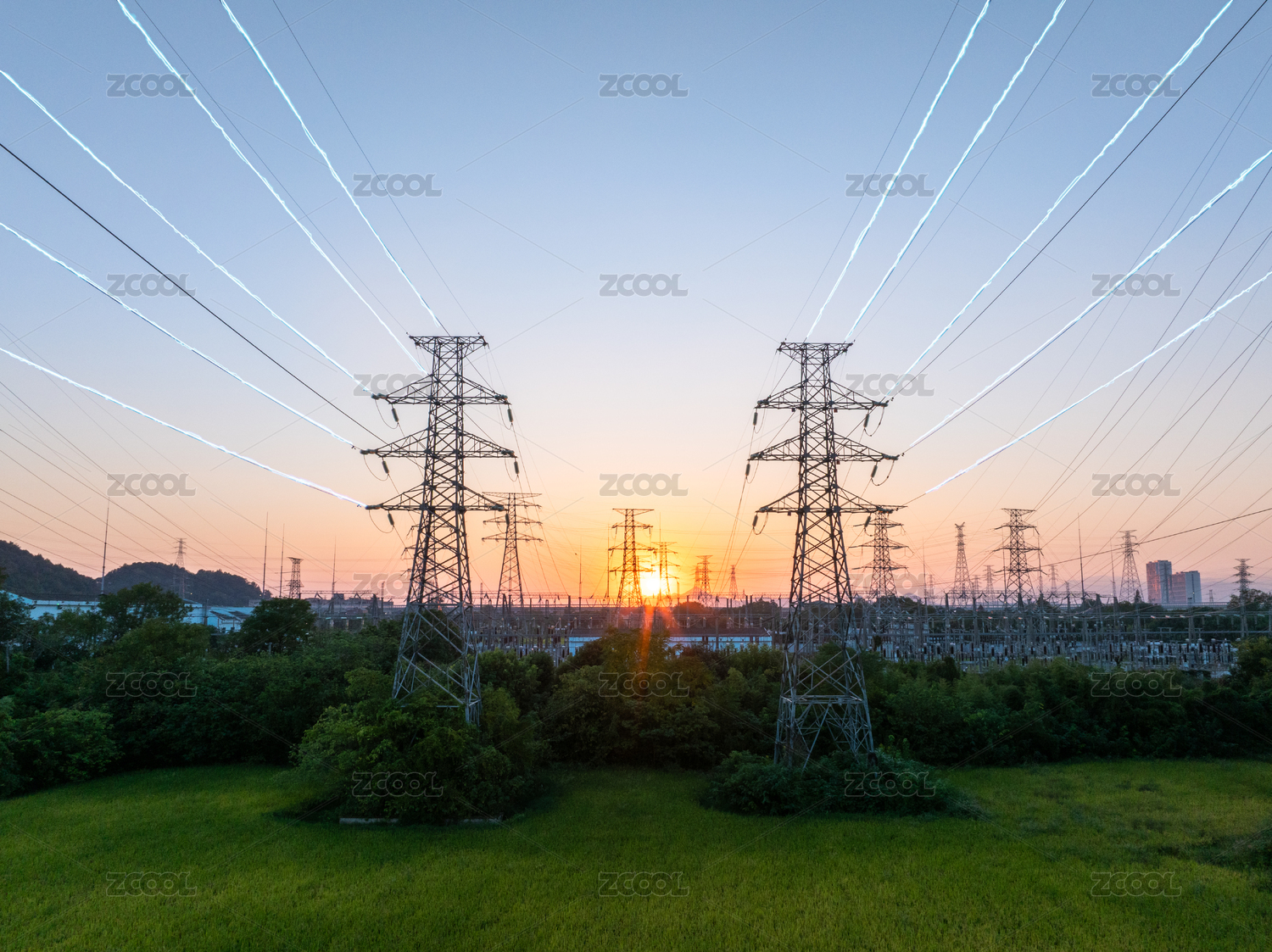 日出時(shí)的高壓電力塔工業(yè)景觀