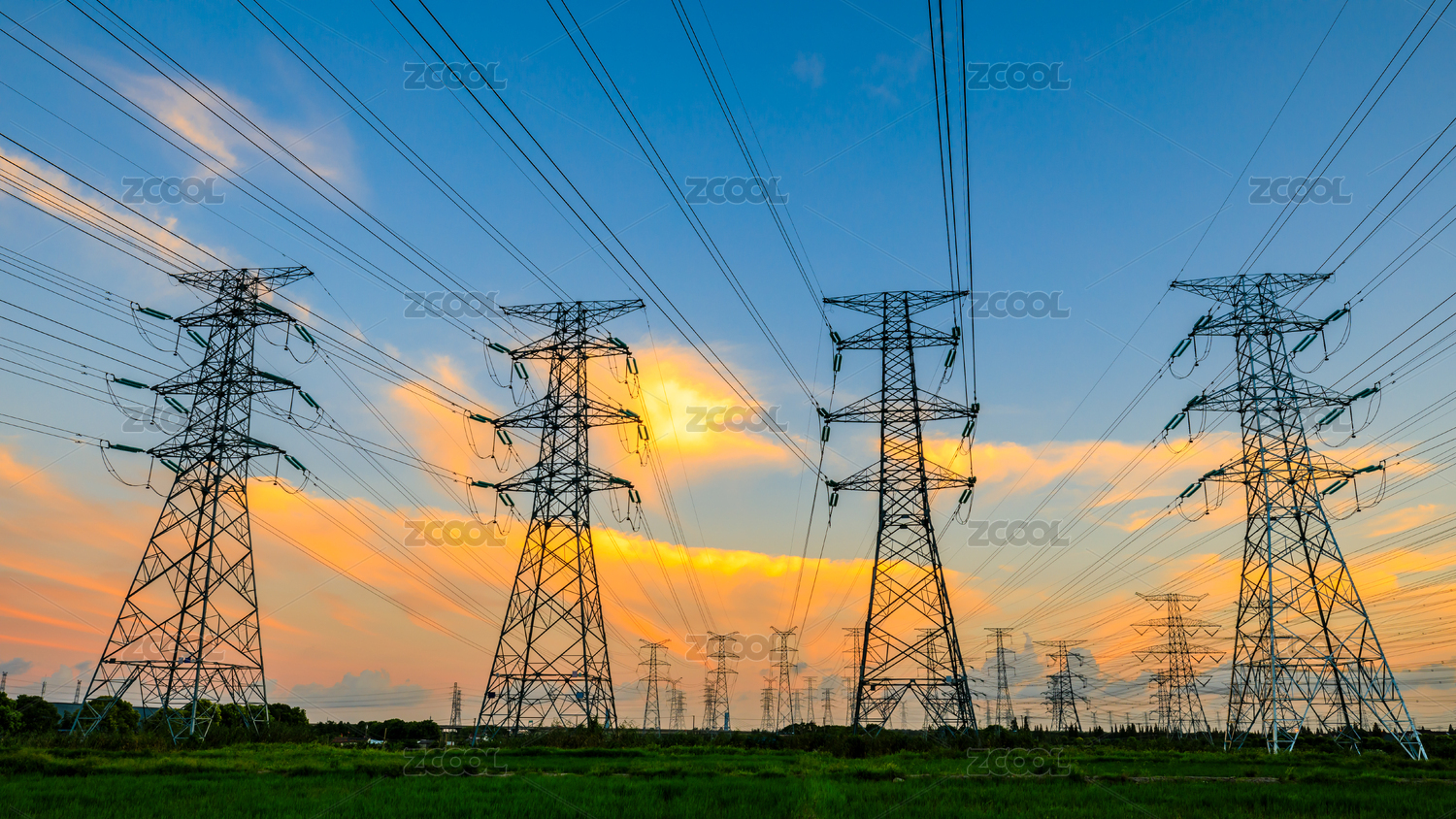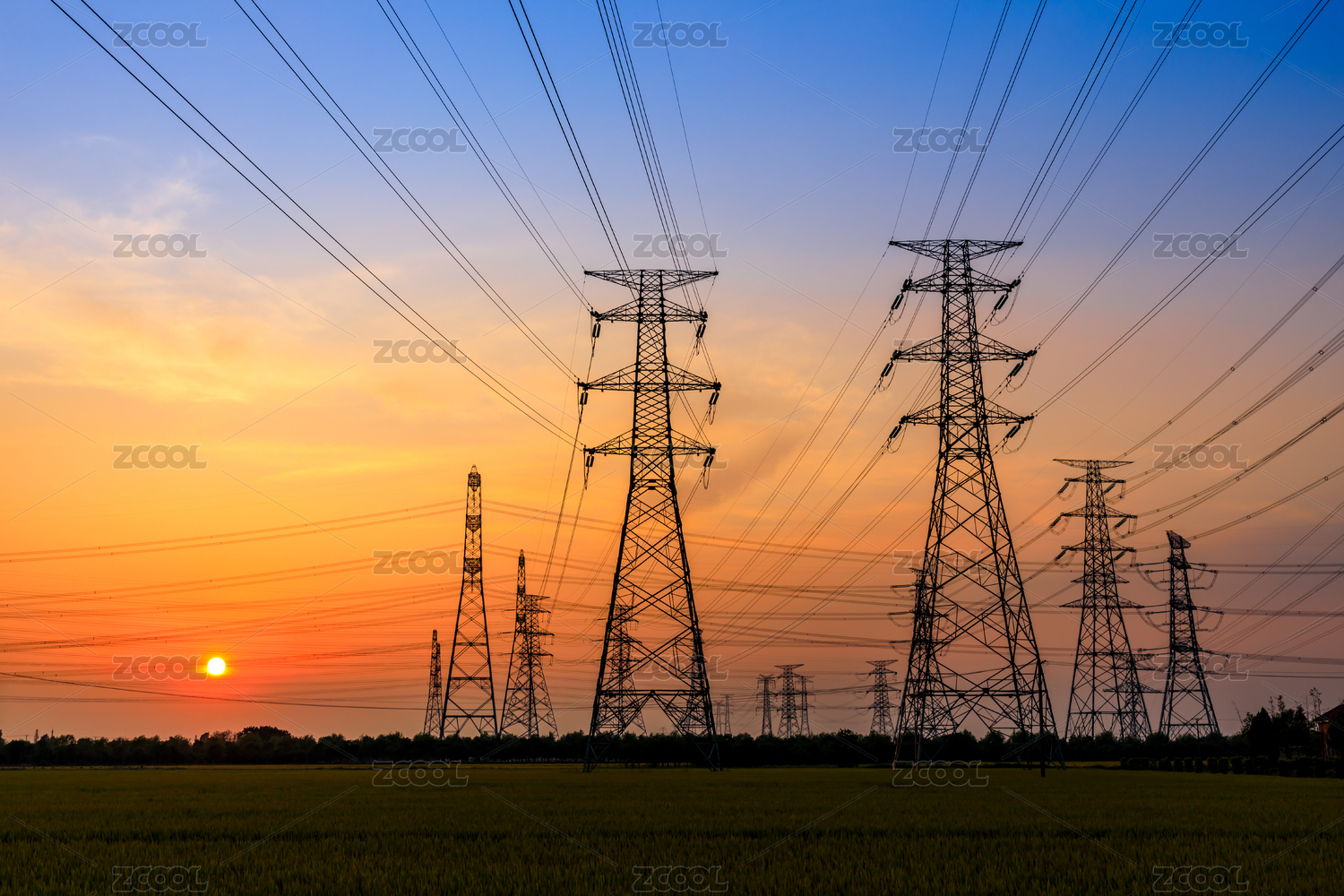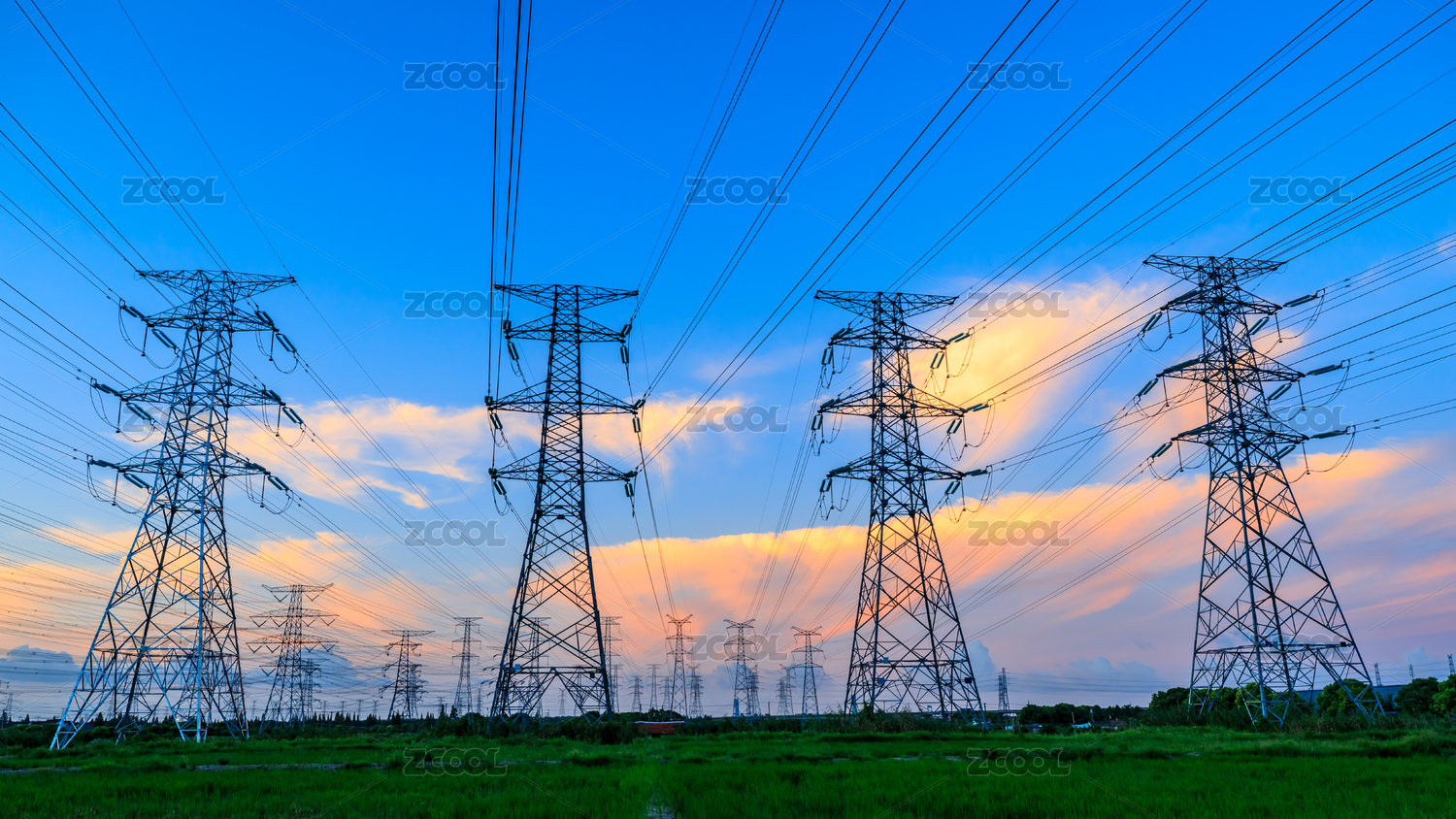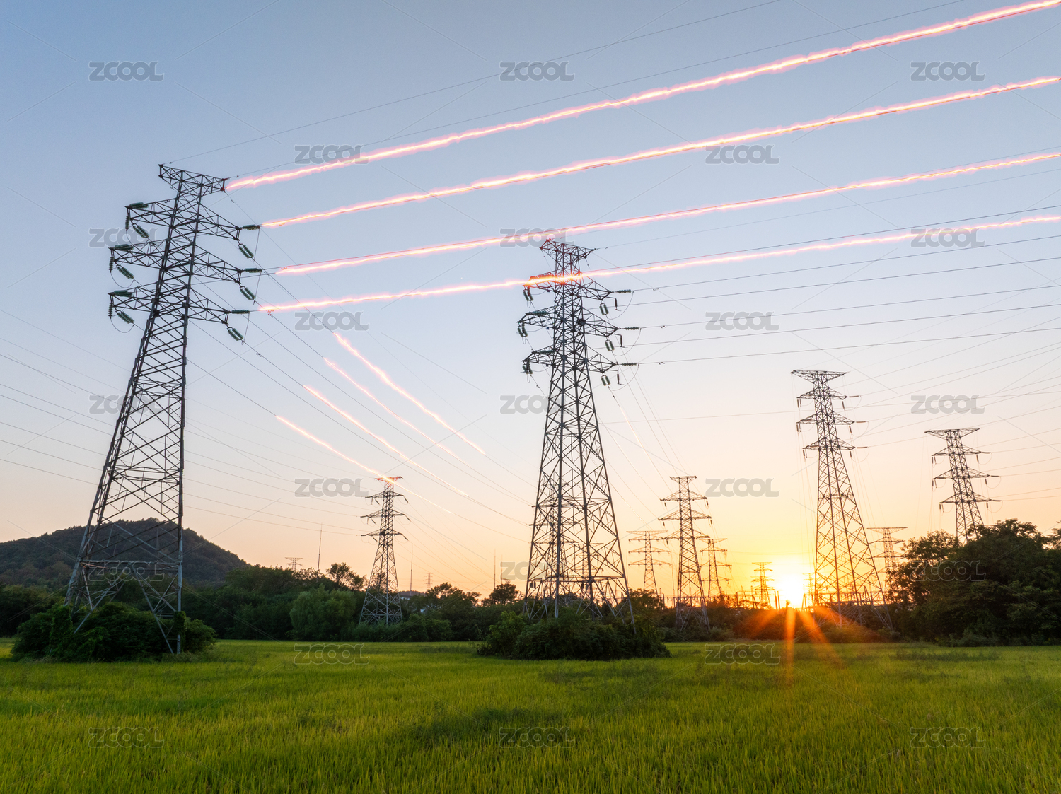 日落時(shí)高壓電力塔和美麗的自然景觀