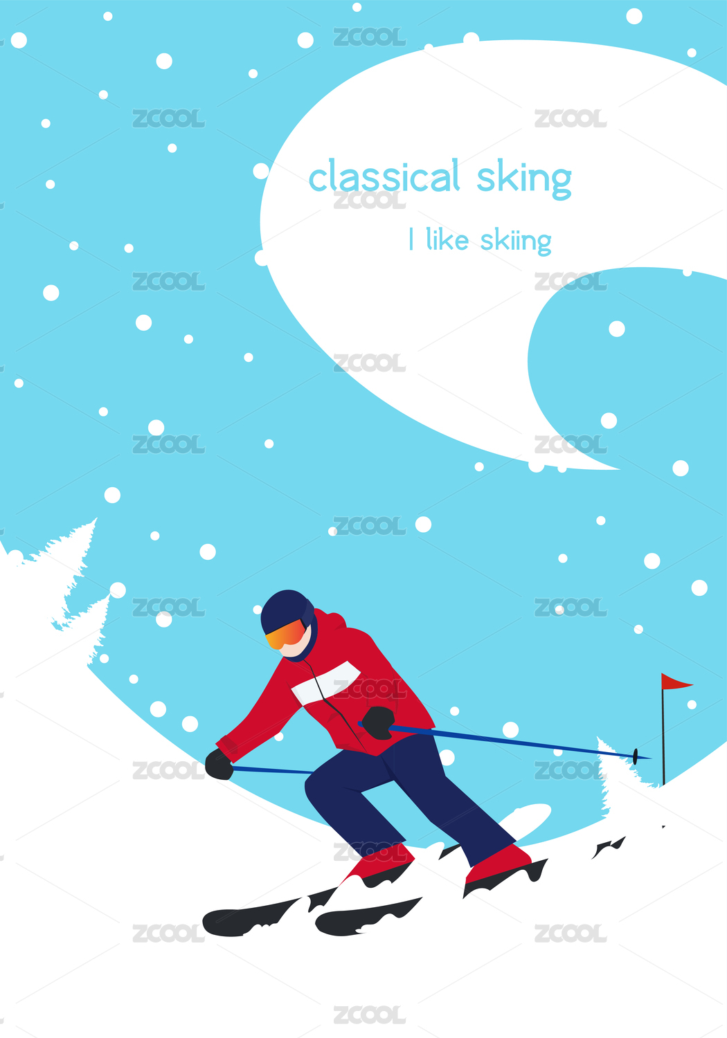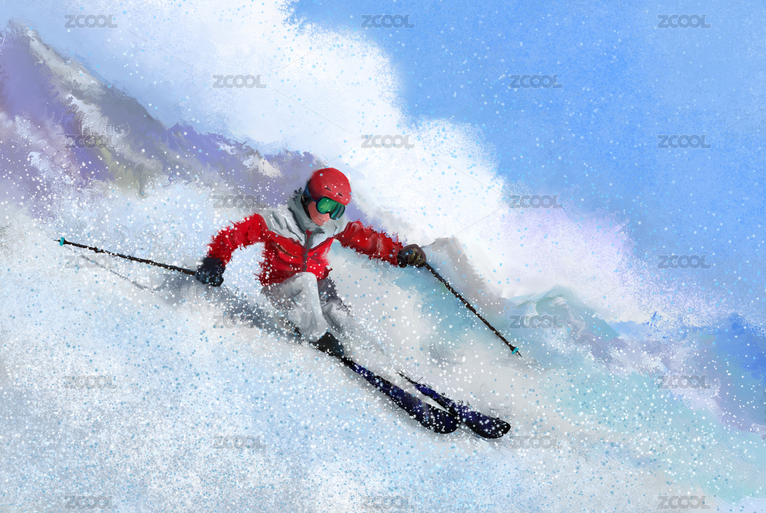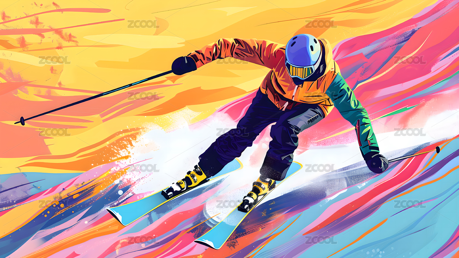 一名男性雙板滑雪者 穿著鮮艷的滑雪服在雪地快速滑行 色塊風(fēng)格手繪插畫