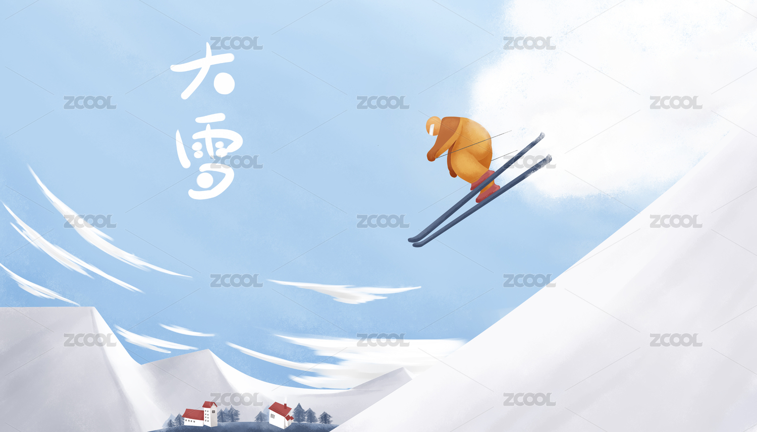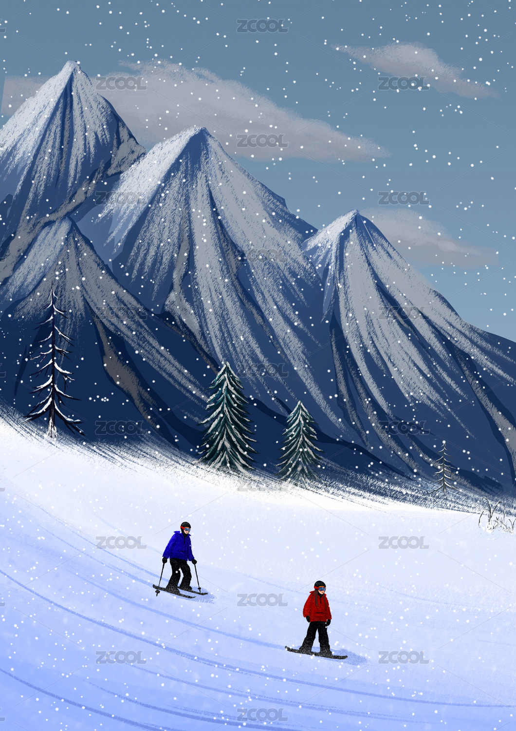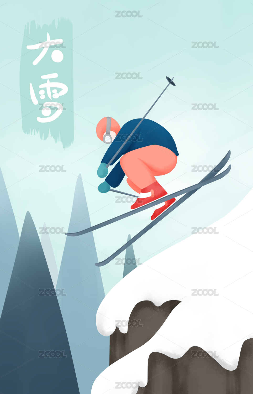 一名男性雙板滑雪者 穿著鮮艷的滑雪服在雪地快速滑行 色塊風(fēng)格手繪插畫