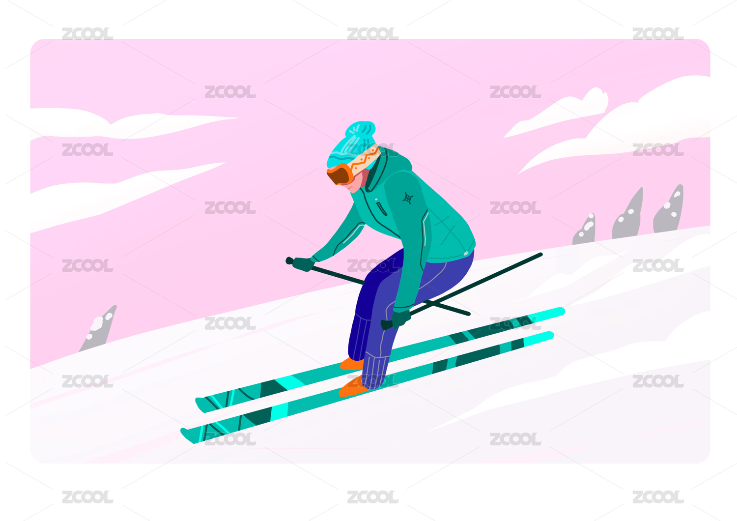 一個(gè)女性雙板滑雪者 穿著鮮艷的滑雪服在雪地快速滑行 滑雪主題手繪插畫