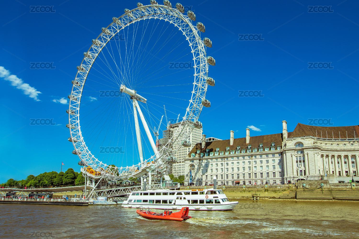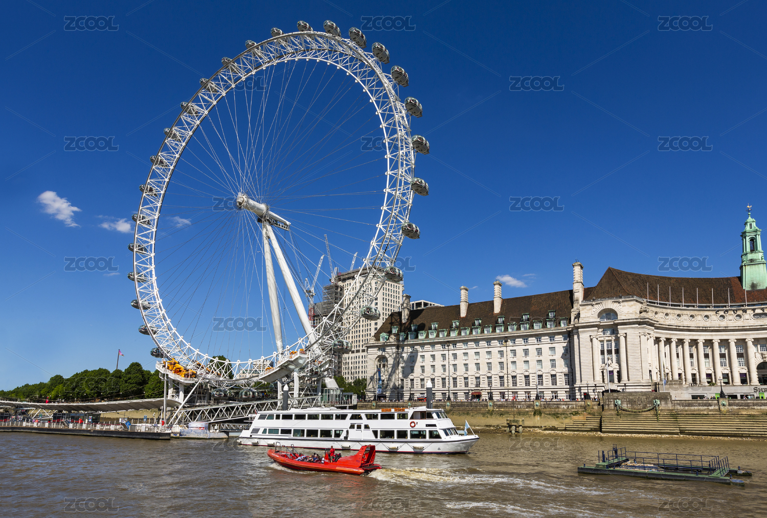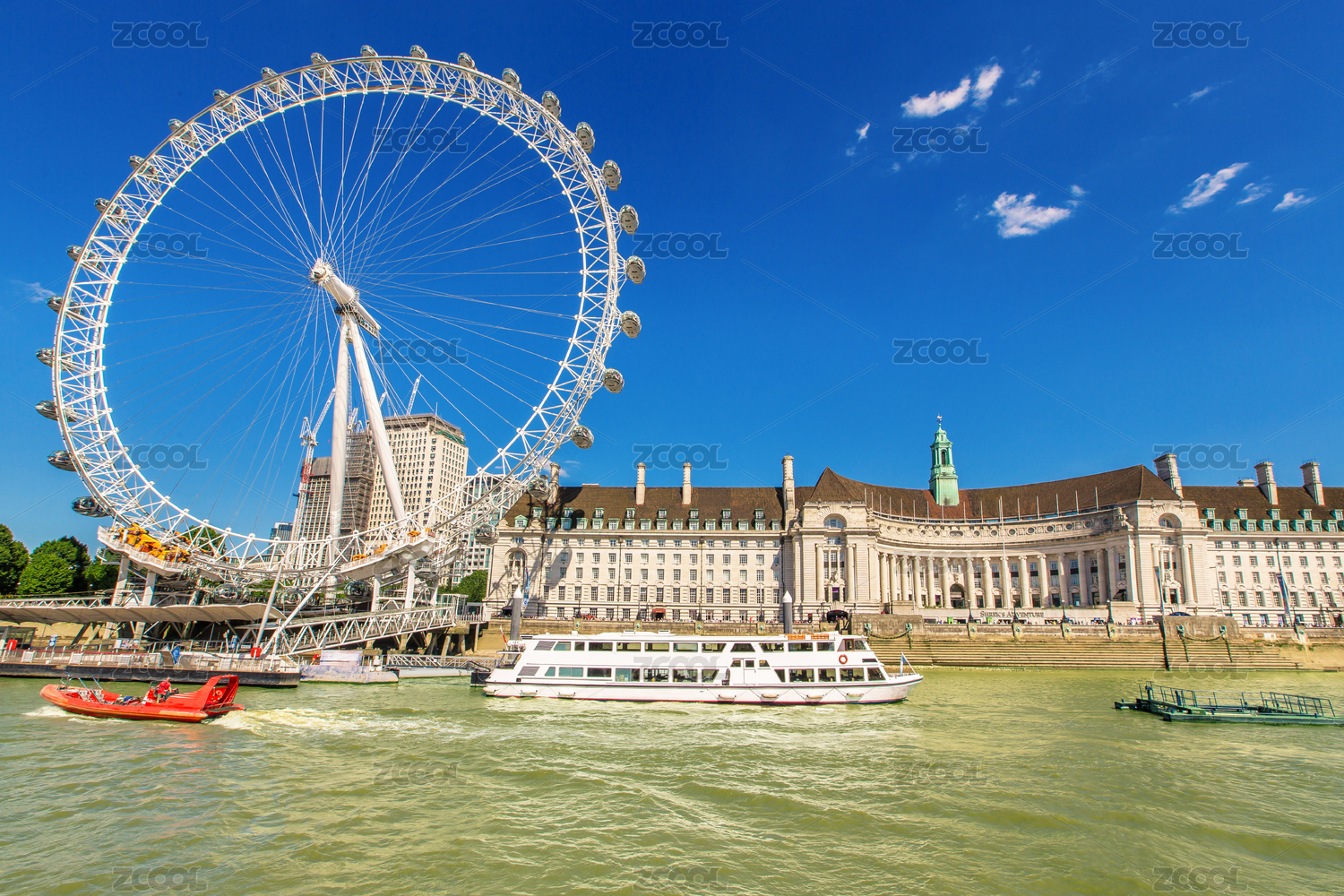 泰晤士河岸邊的倫敦眼、史瑞克冒險樂園和游船上的鴿子