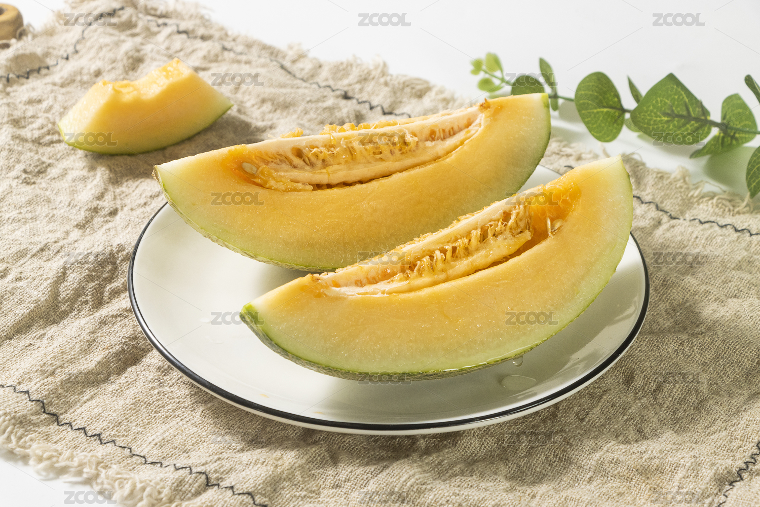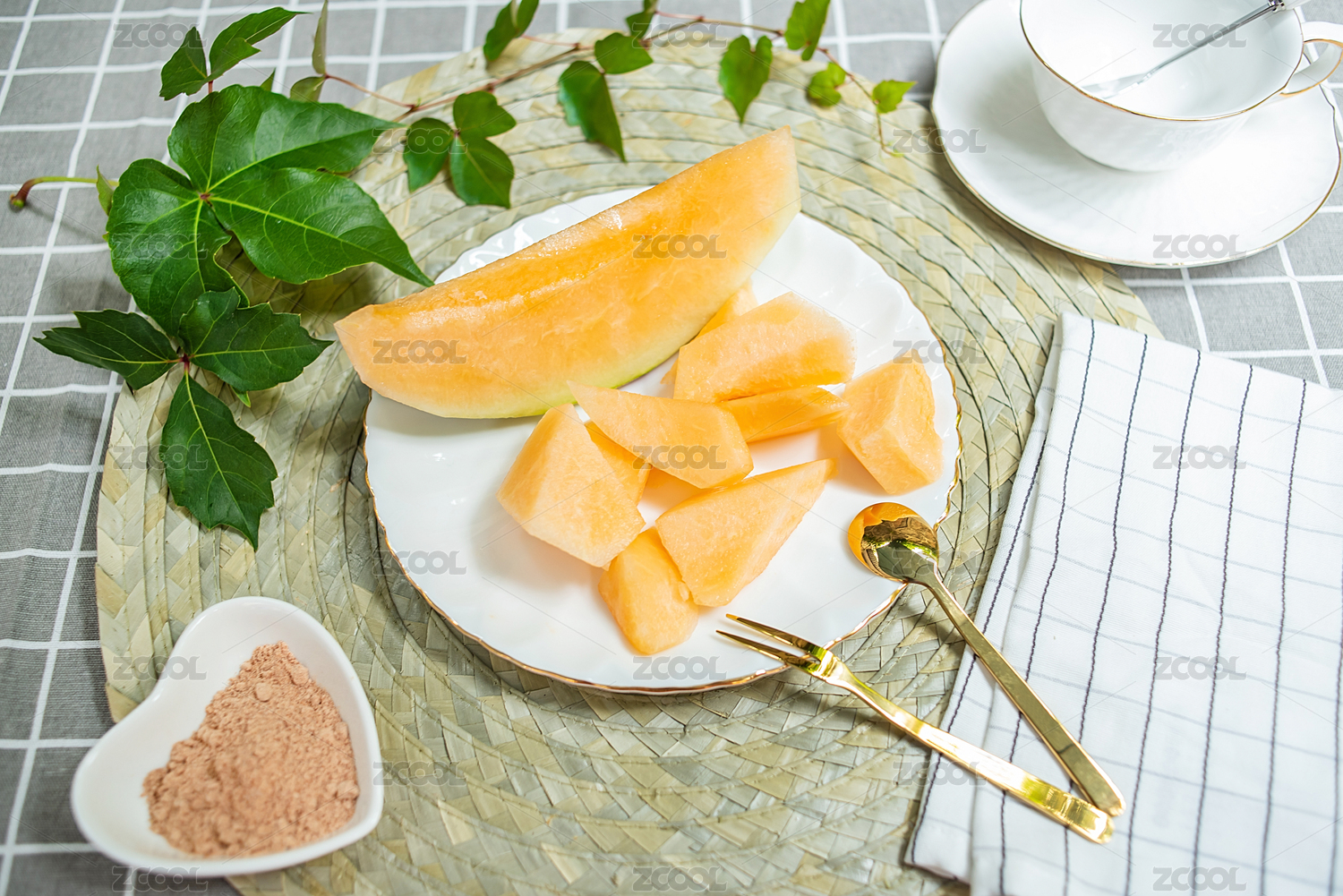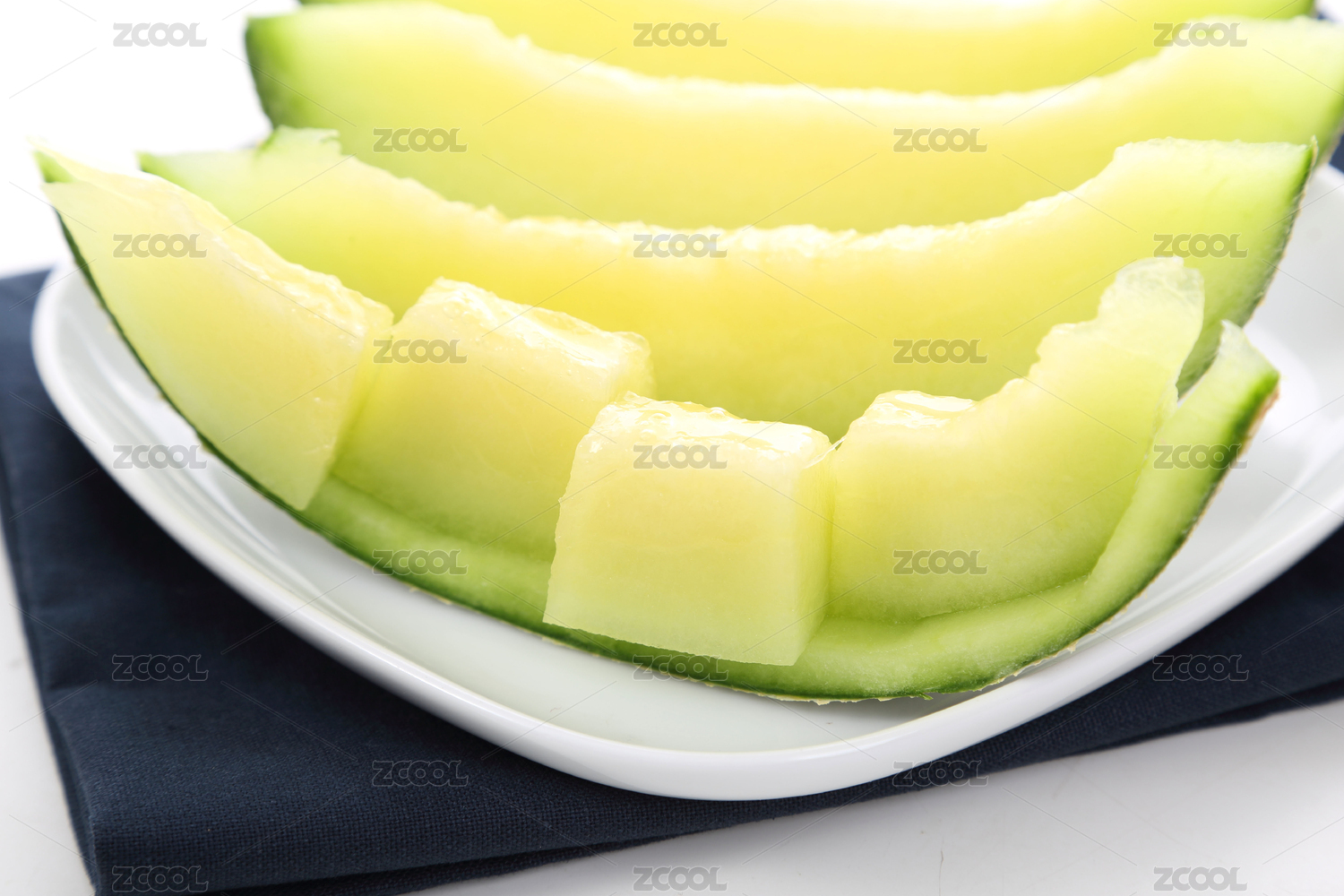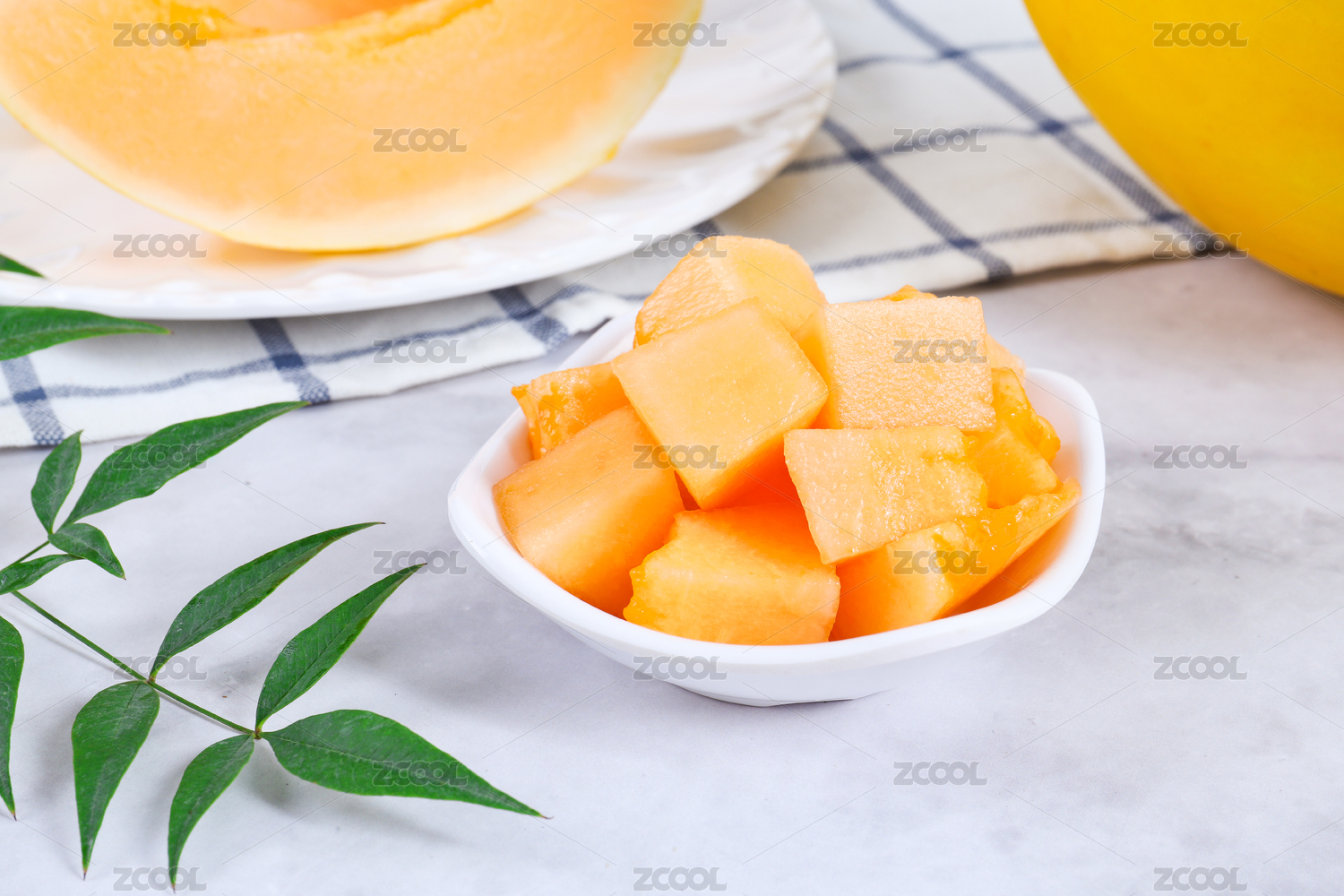 放在大理石背景碟子里切塊的黃河蜜瓜果肉塊
