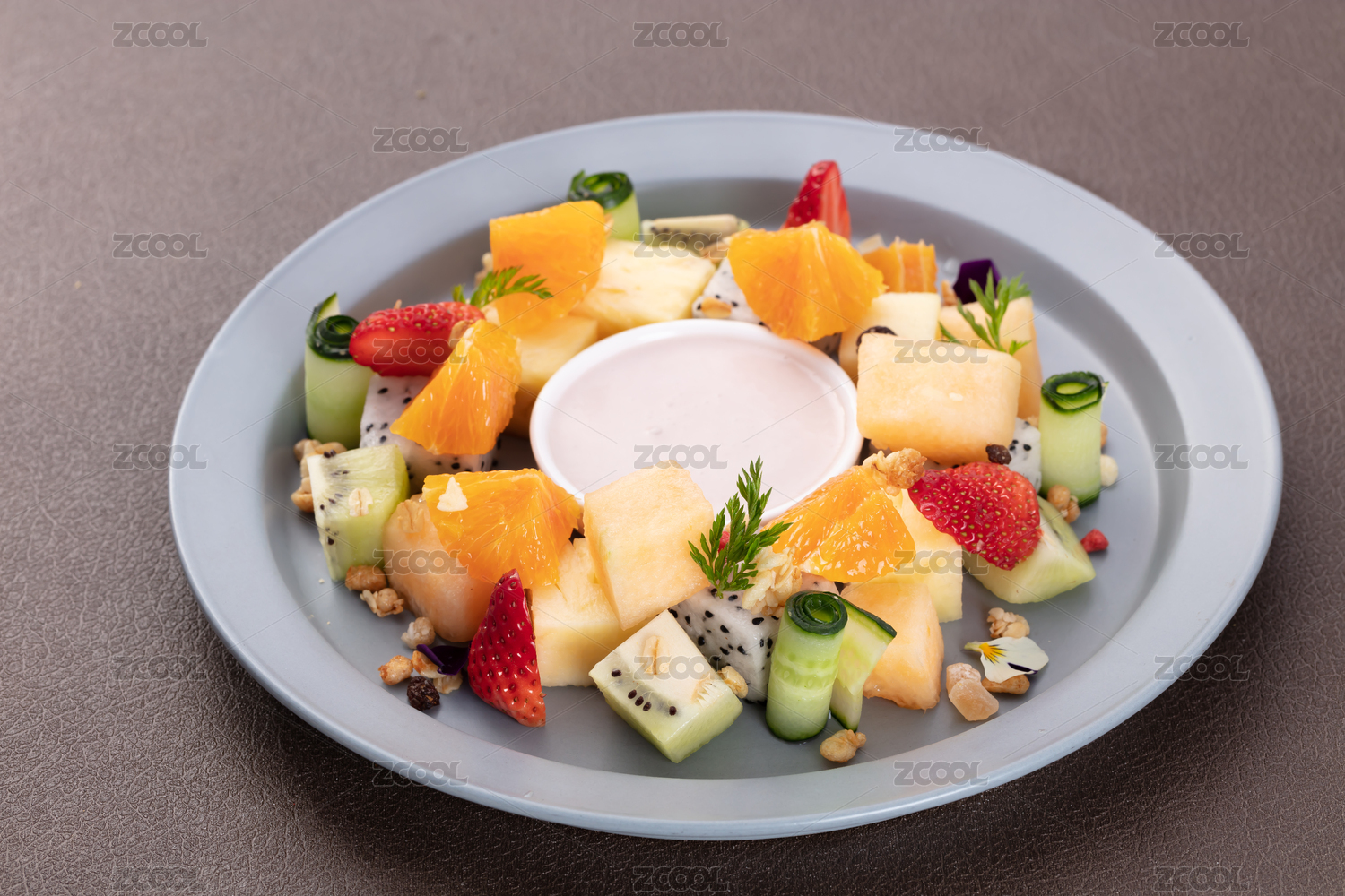 盤子里的西餐料理哈蜜瓜草莓獼猴桃水果沙拉