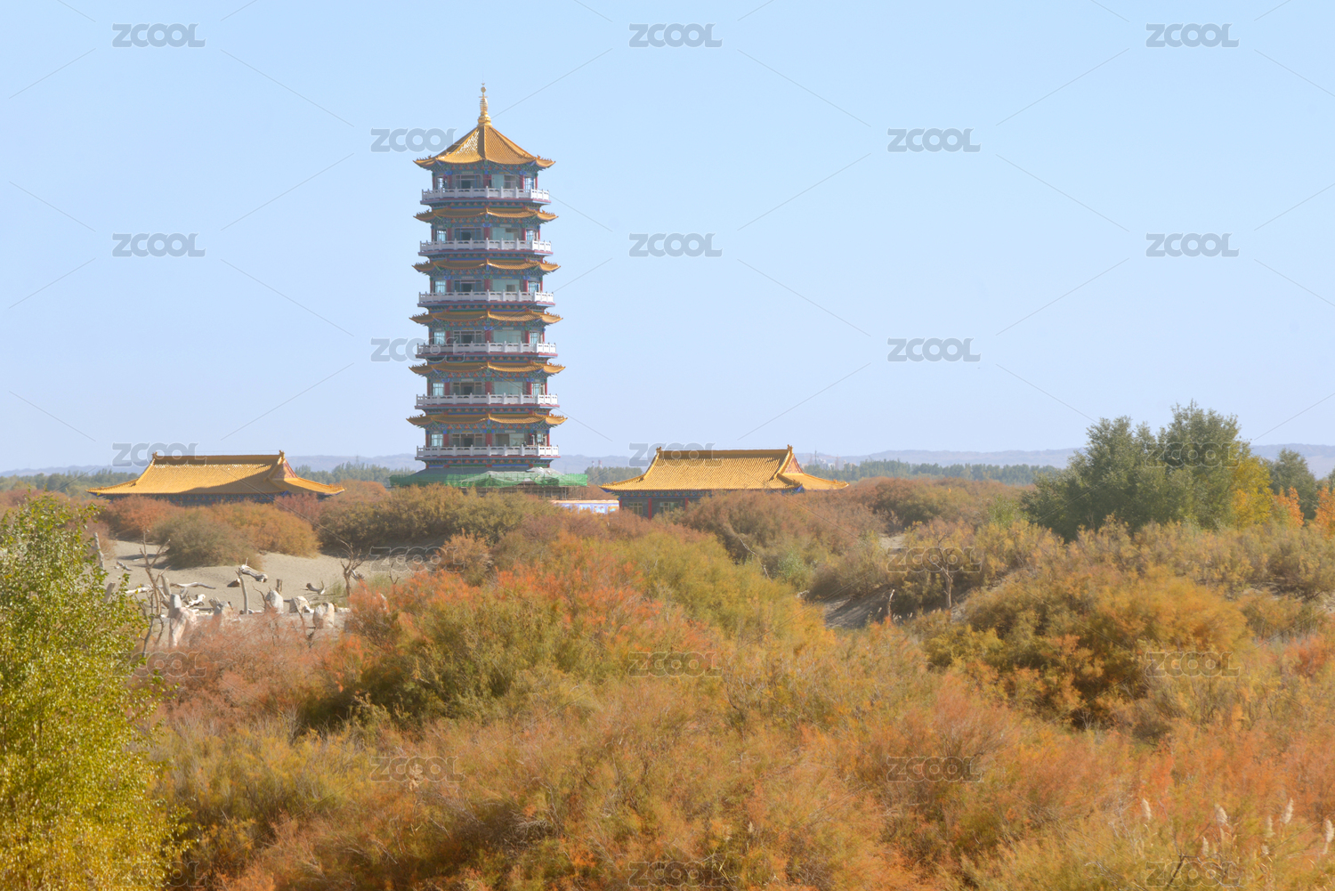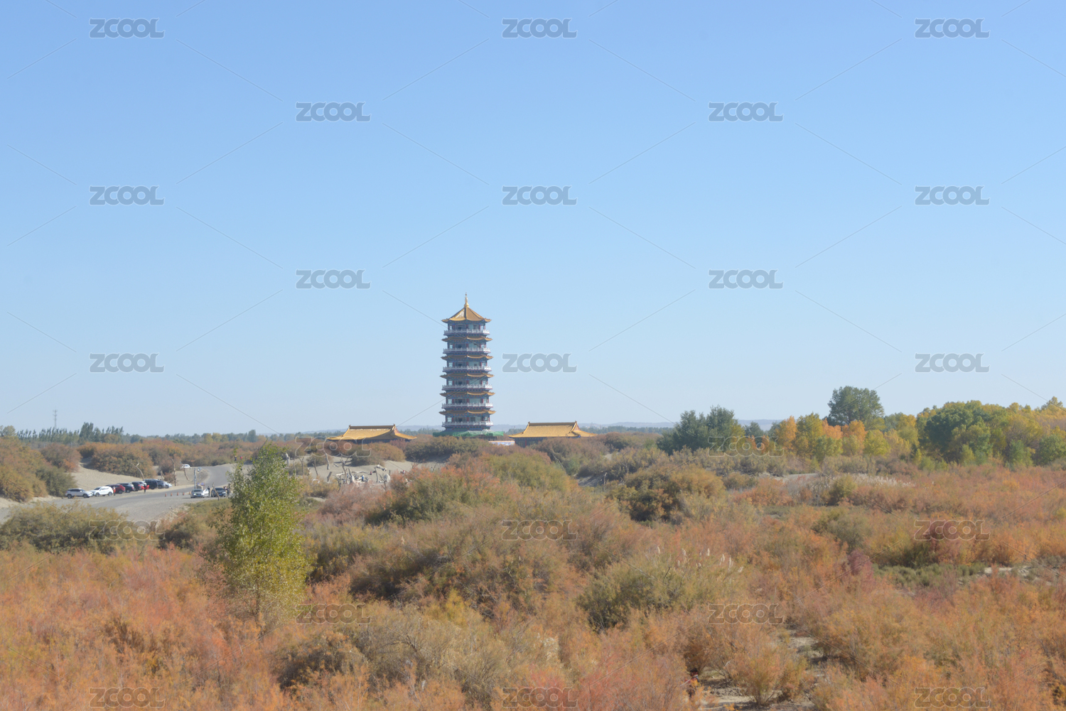 甘肅金塔胡楊林景區(qū)紅柳灌木林及金塔高塔