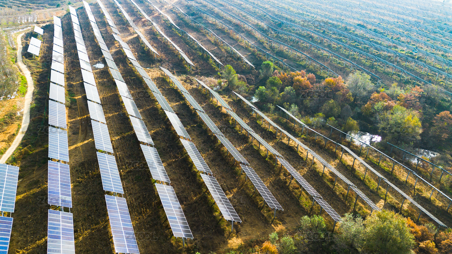 航拍中國(guó)山東煙臺(tái)太陽(yáng)能光伏發(fā)電場(chǎng)