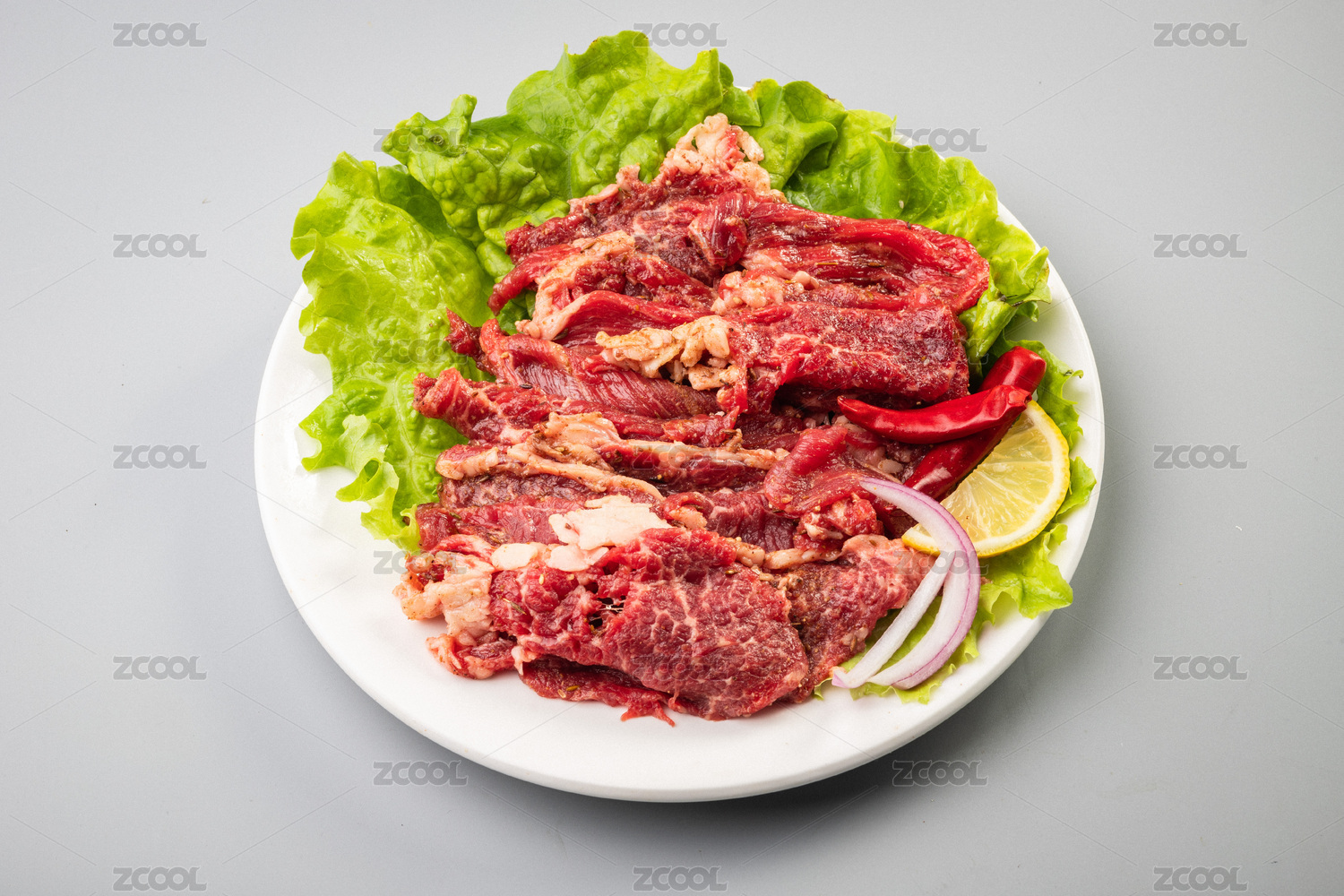白色桌面上有一盤生制炒烤牛肉切片